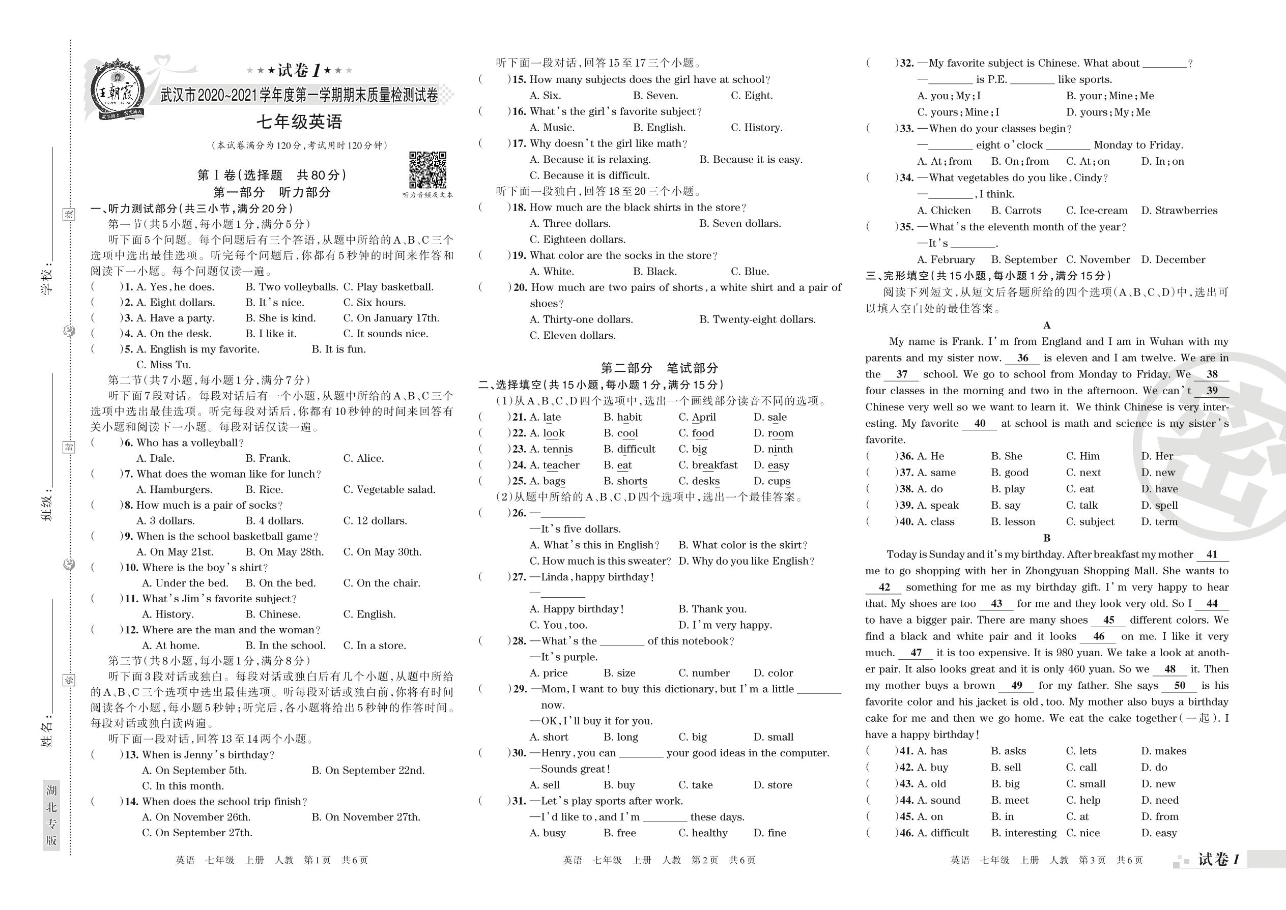 武汉市2020~2021学年度第一学期期末质量检测试卷七年级英语(人教版)【1】