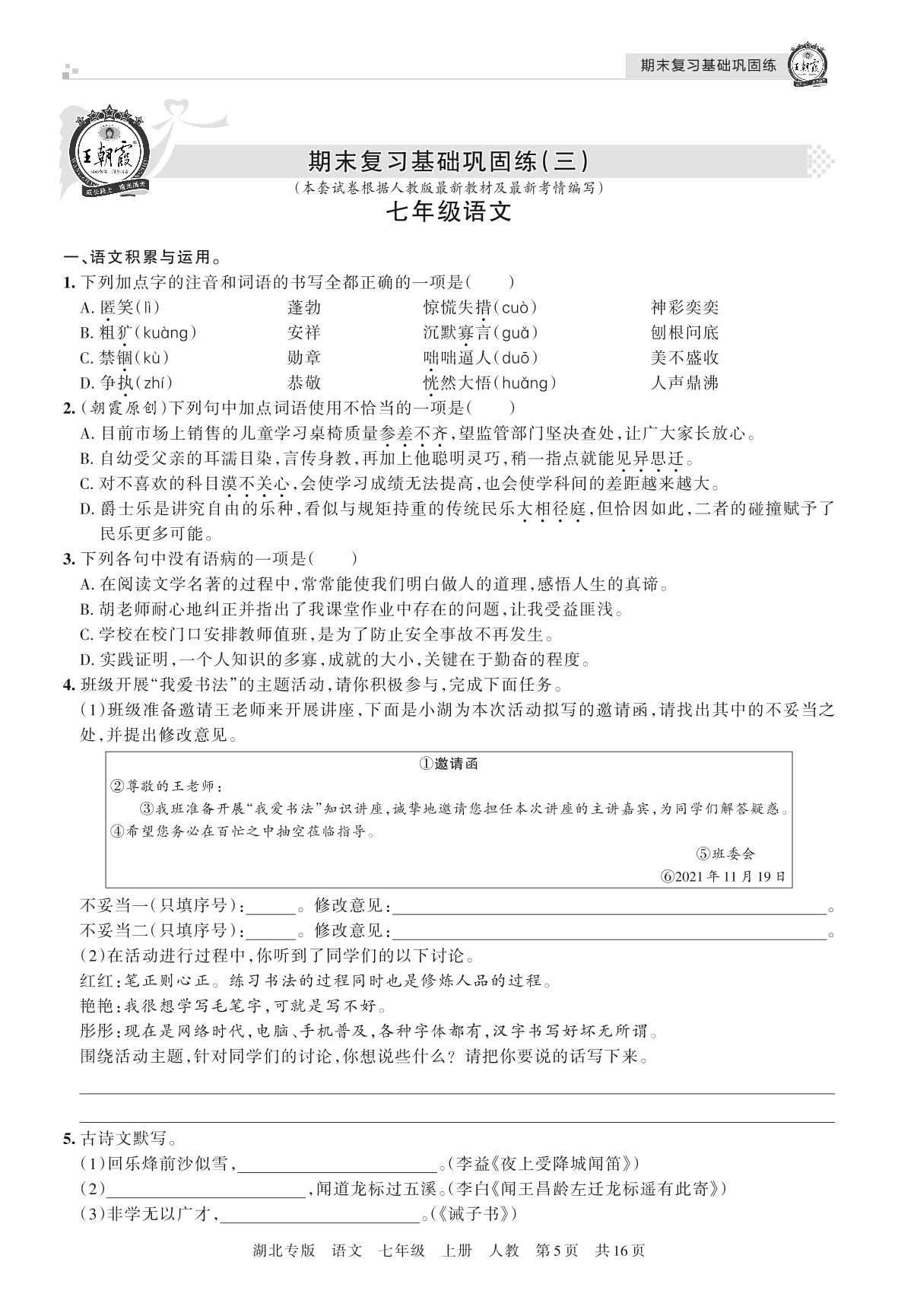 王朝霞期末小卷——期末复习基础巩固练(三)七年级上册语文(人教版)【3】