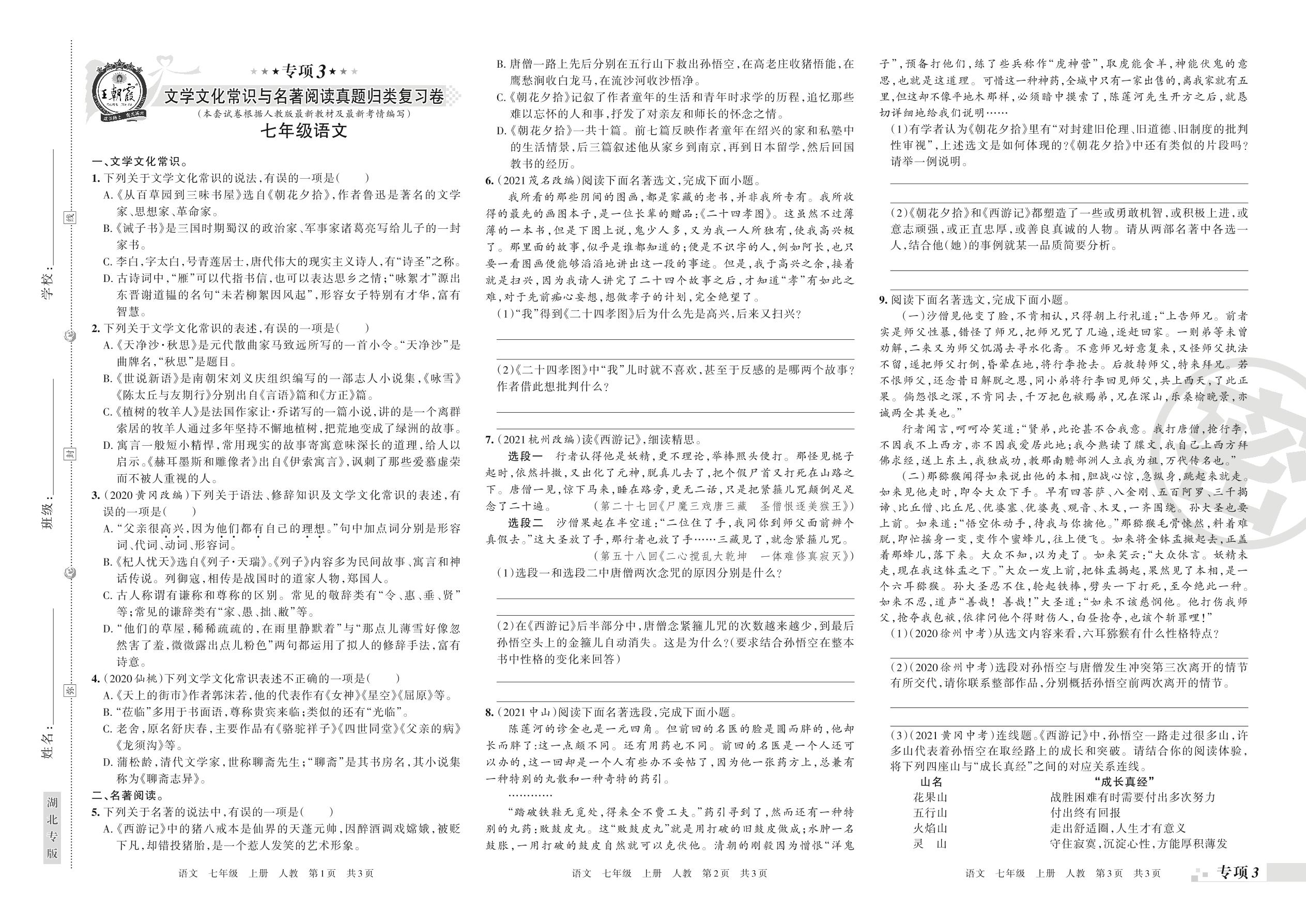 王朝霞期末专项卷——文学文化常识与名著阅读真题归类复习卷七年级上册语文(人教版)【3】
