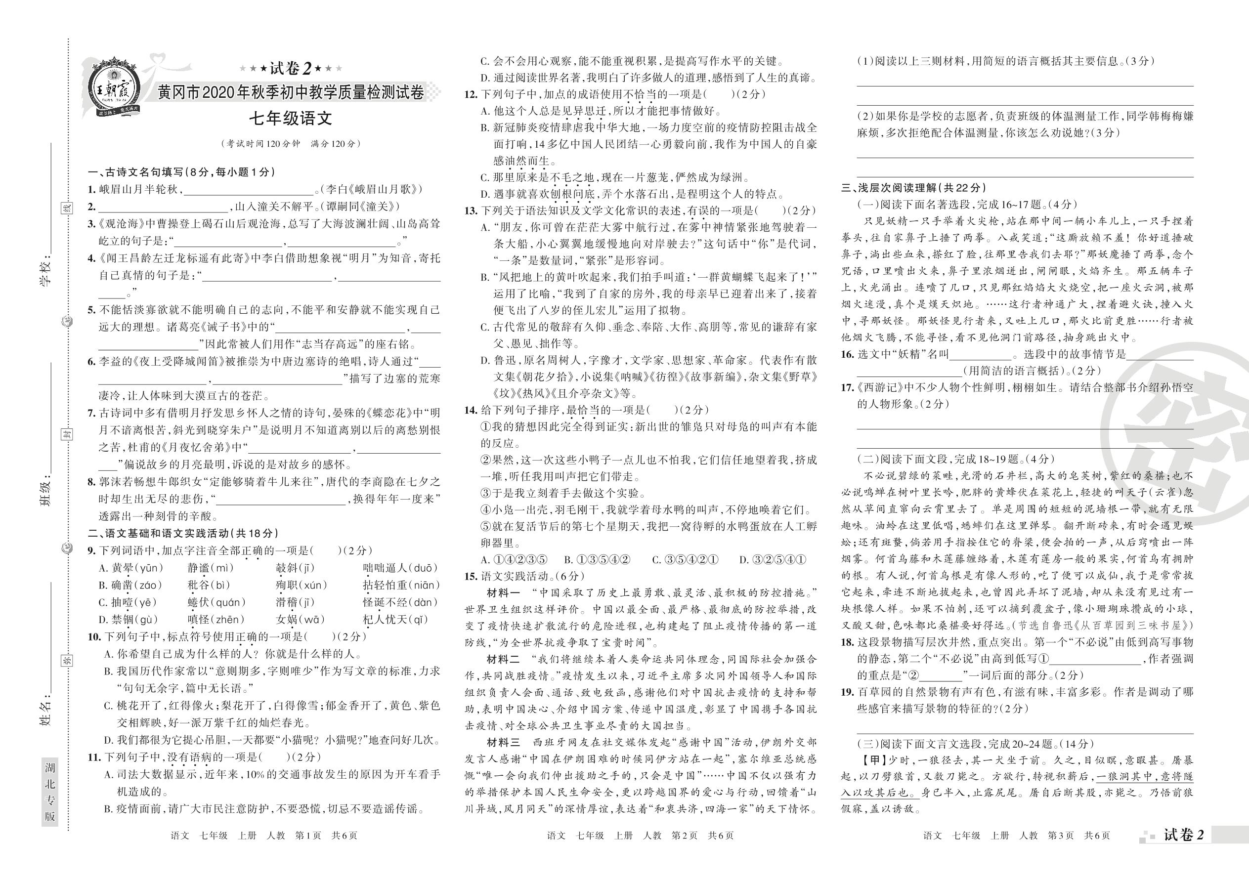 黄冈市2020年秋季初中教学质量检测试卷七年级语文(人教版)【2】
