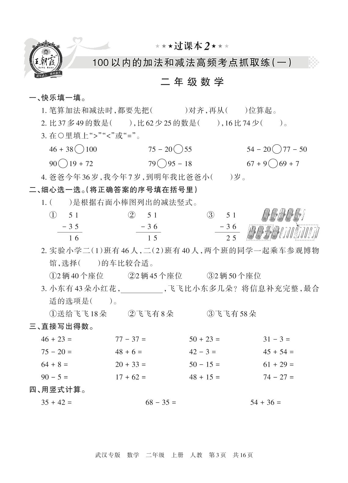 王朝霞期末过课本——100以内的加法和减法高频考点抓取练(一)二年级上册数学(人教版)_R211112135040776【2】