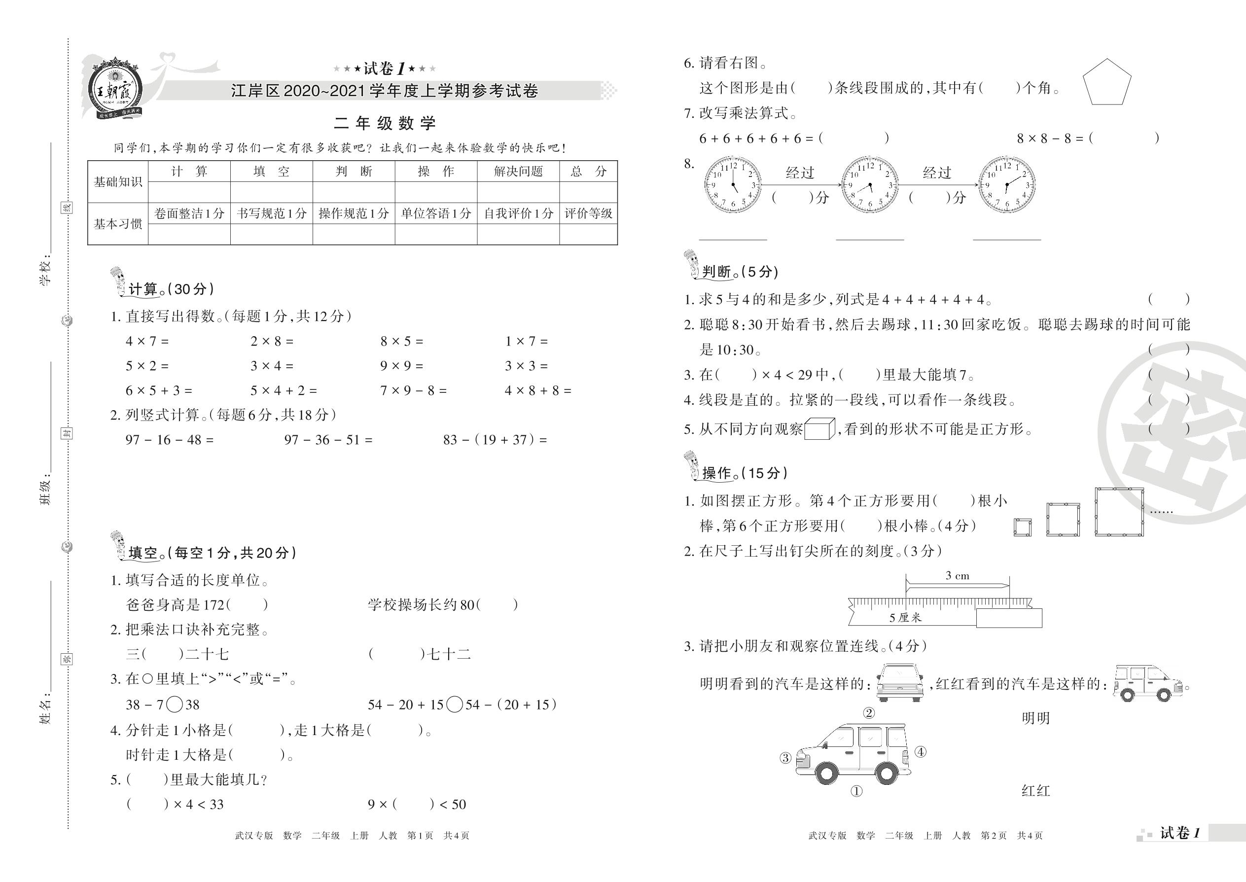 江岸区2020~2021学年度上学期参考试卷二年级数学(人教版)【1】
