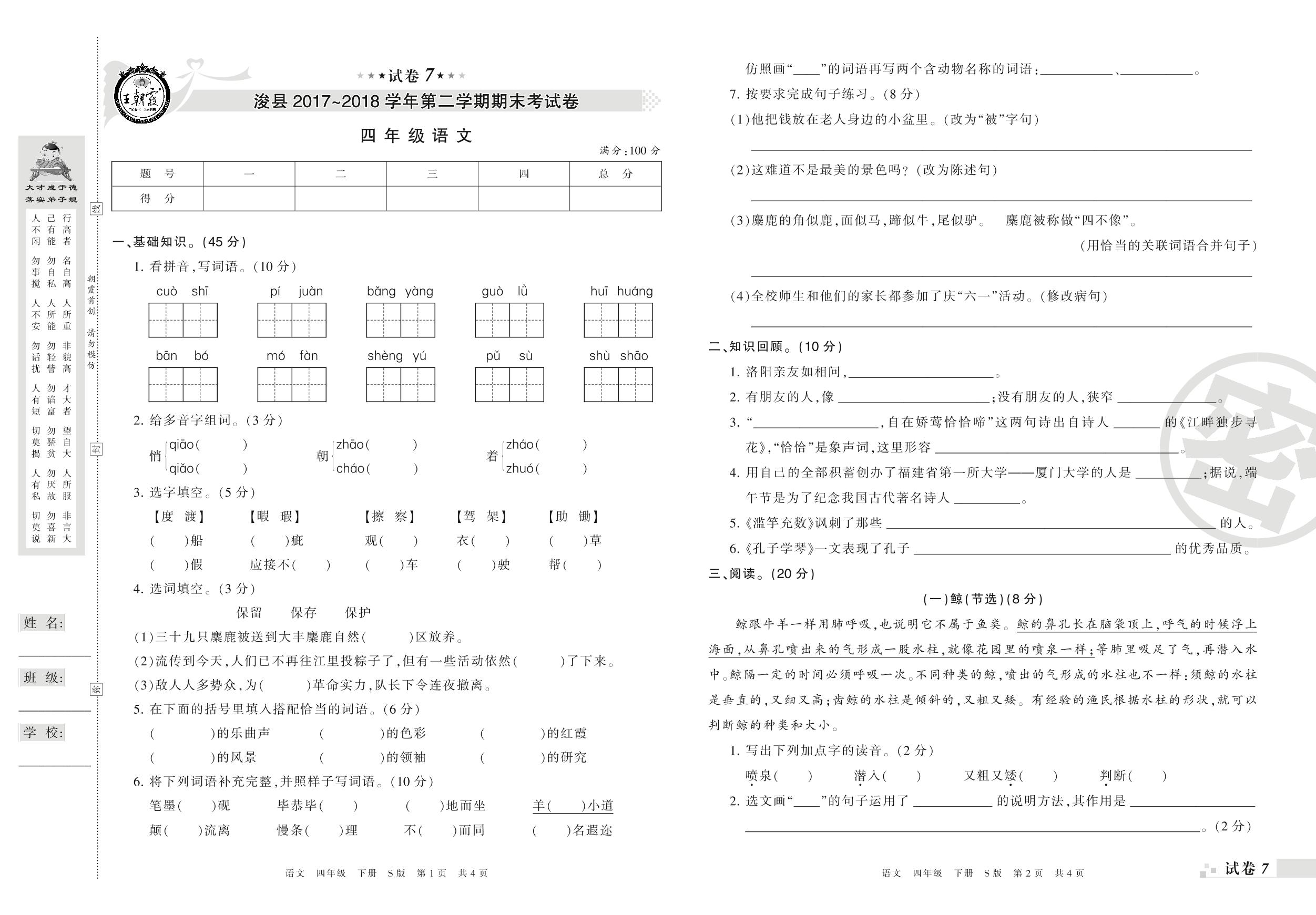 2017-2018学年第二学期鹤壁市浚县四年级语文试卷(S版)【7】