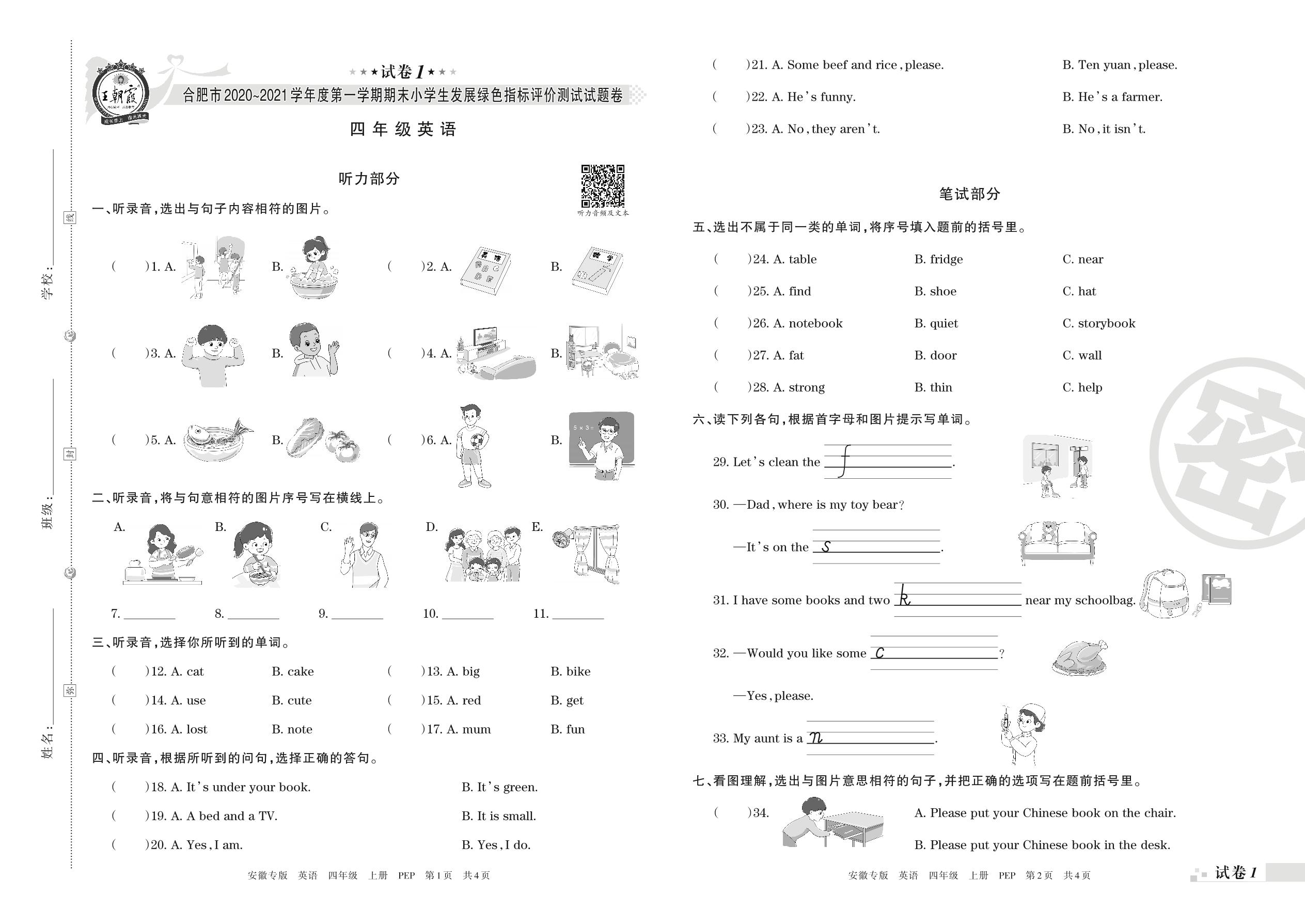 合肥市2020~2021学年度第一学期期末小学生发展绿色指标评价测试试题卷四年级英语(人教PEP版)【1】