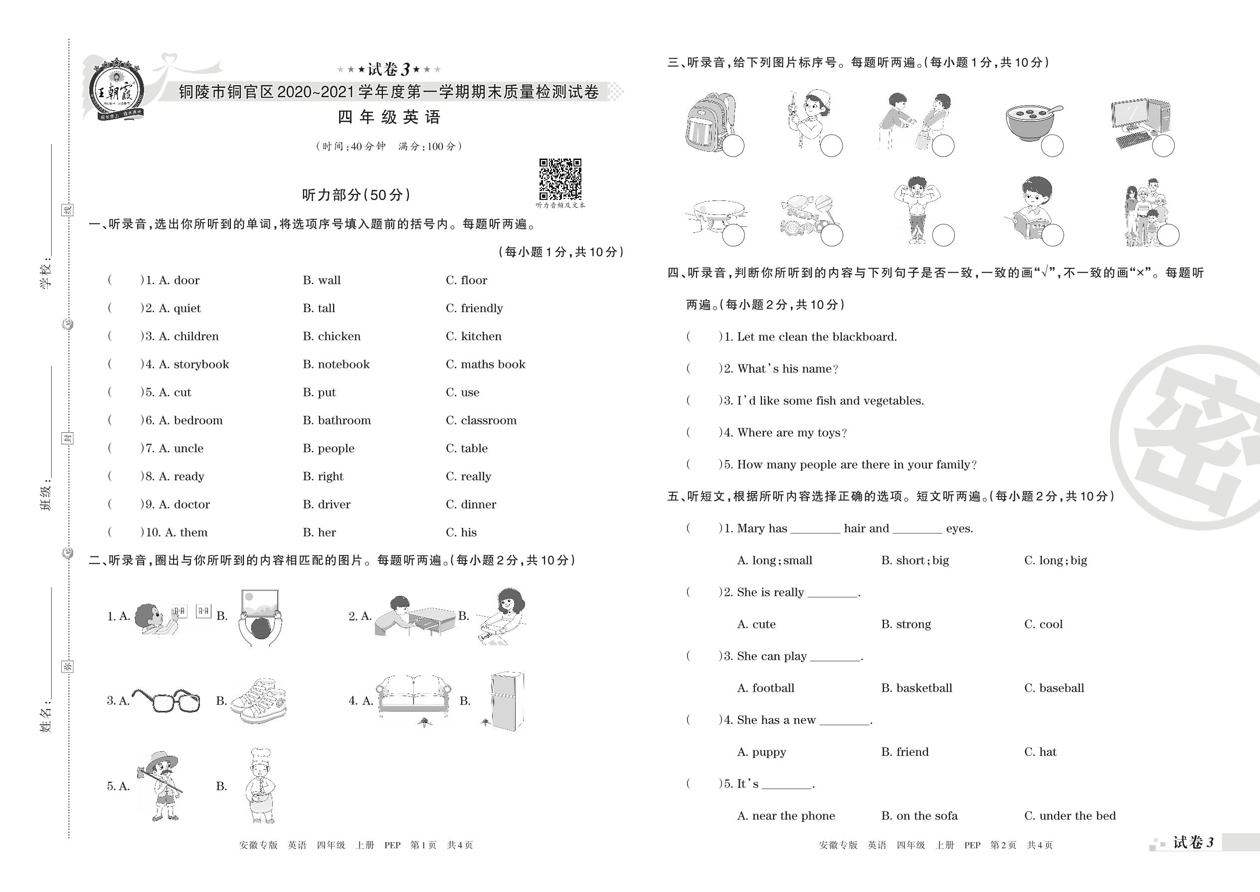 铜陵市铜官区2020~2021学年度第一学期期末质量检测试卷四年级英语(人教PEP版)【3】
