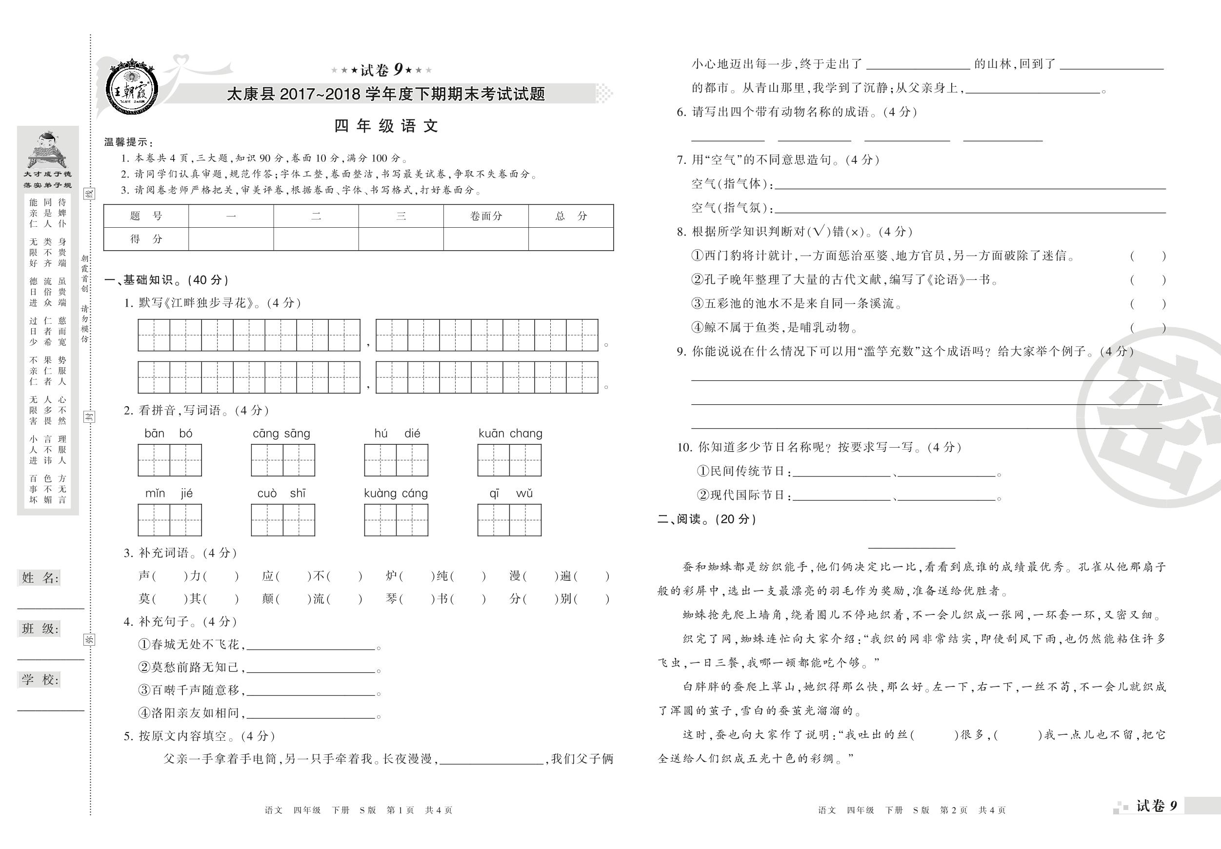 2017-2018学年第二学期周口市太康县四年级语文试卷(S版)【9】