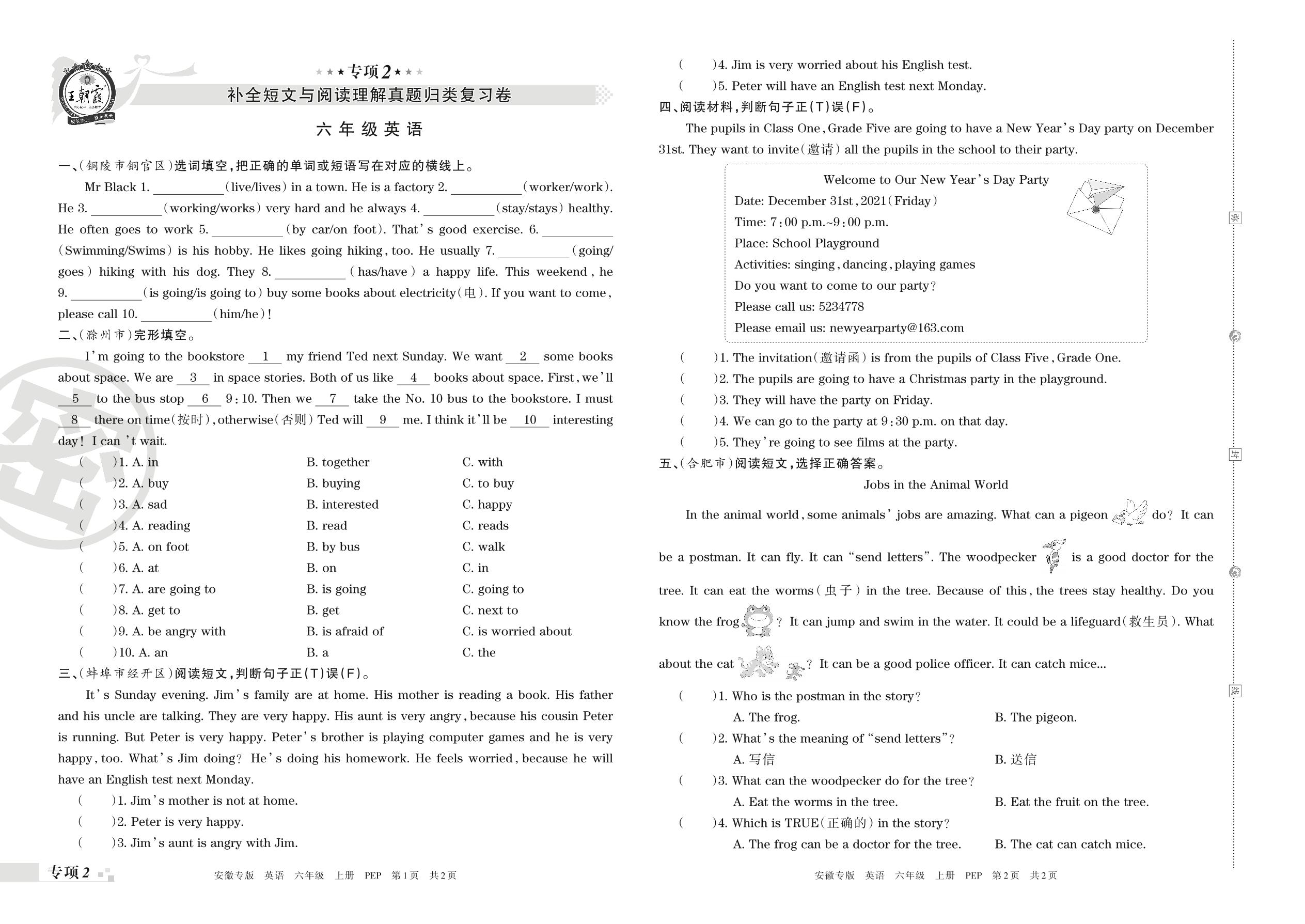 王朝霞期末专项卷——补全短文与阅读理解真题归类复习卷六年级上册英语(人教PEP版)【2】