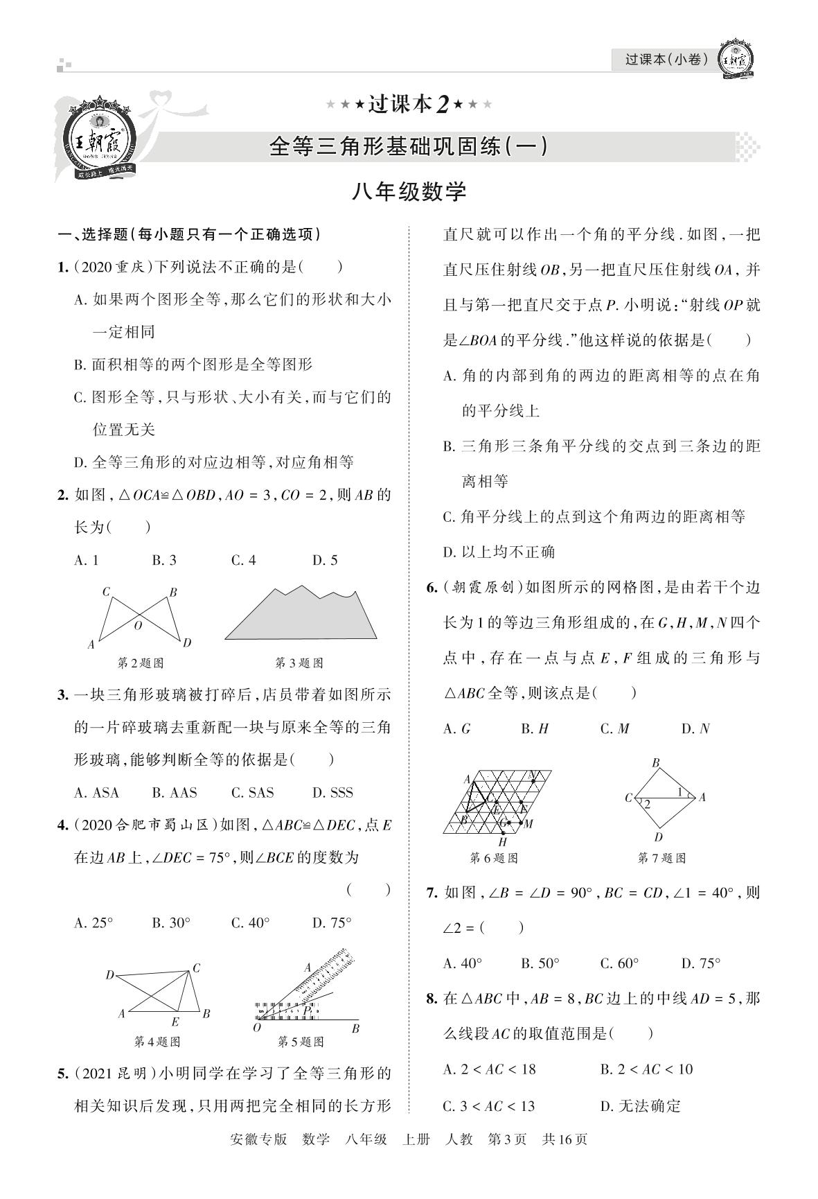 王朝霞期末过课本——全等三角形基础巩固练(一)八年级上册数学(人教版)【2】
