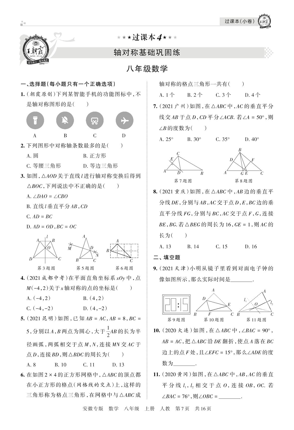 王朝霞期末过课本——轴对称基础巩固练八年级上册数学(人教版)【4】