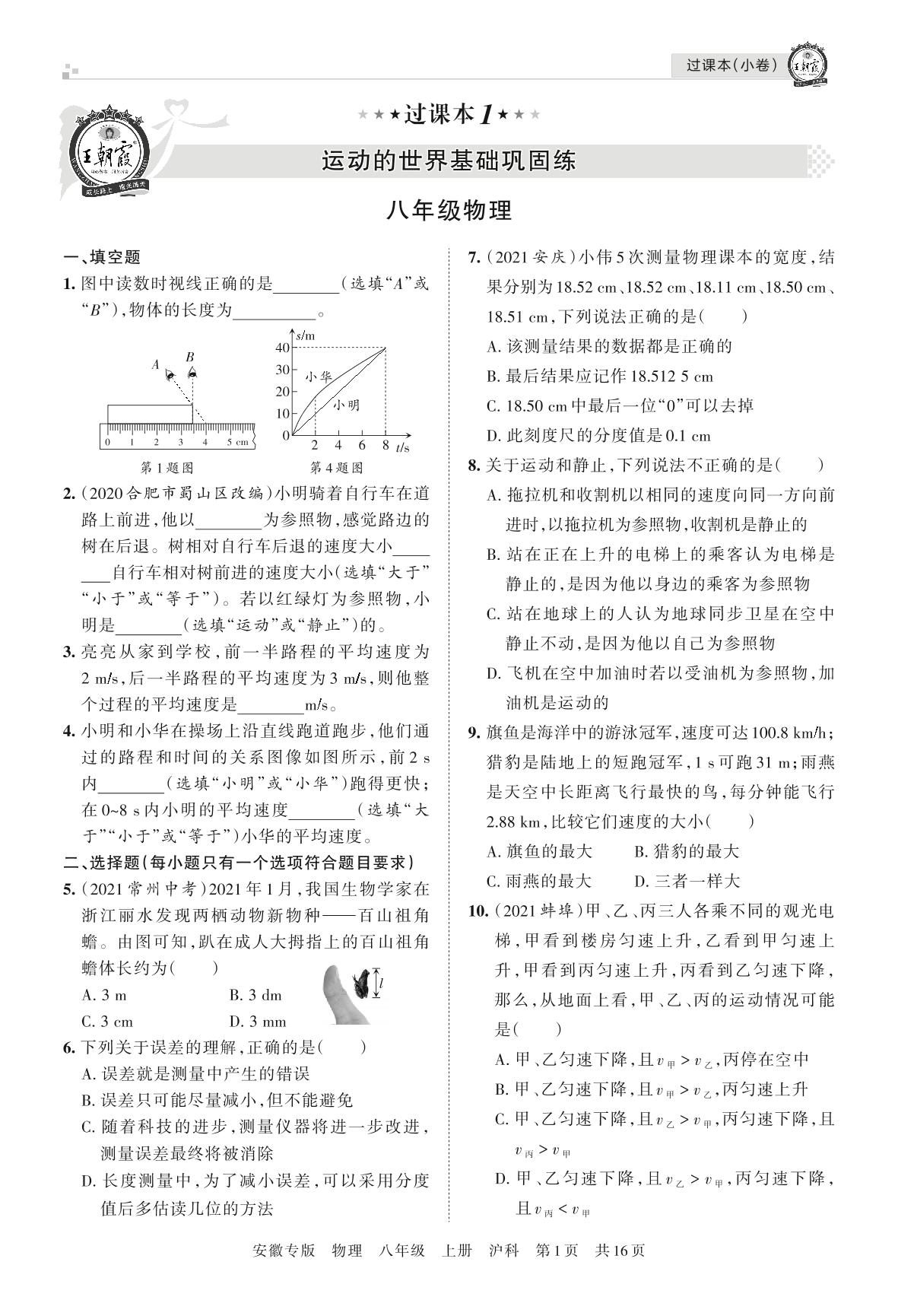 王朝霞期末过课本——运动的世界基础巩固练八年级上册物理(沪科版)【1】