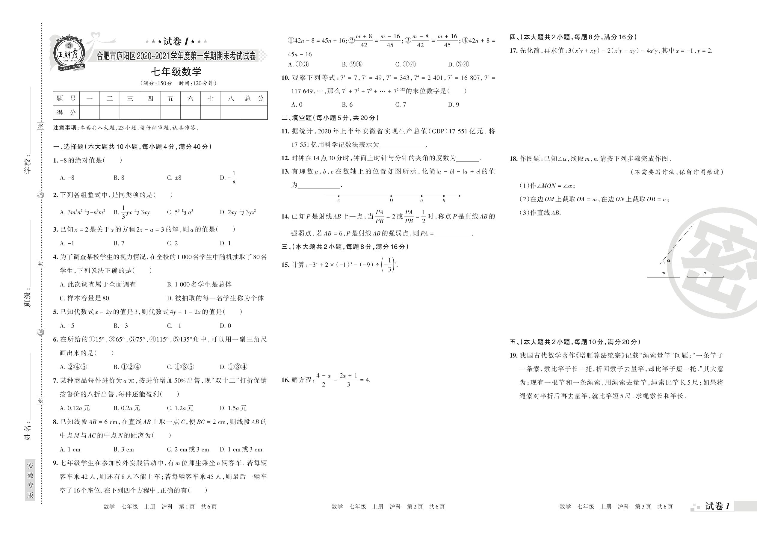 合肥市庐阳区2020~2021学年度第一学期期末考试试卷七年级数学(沪科版)【1】