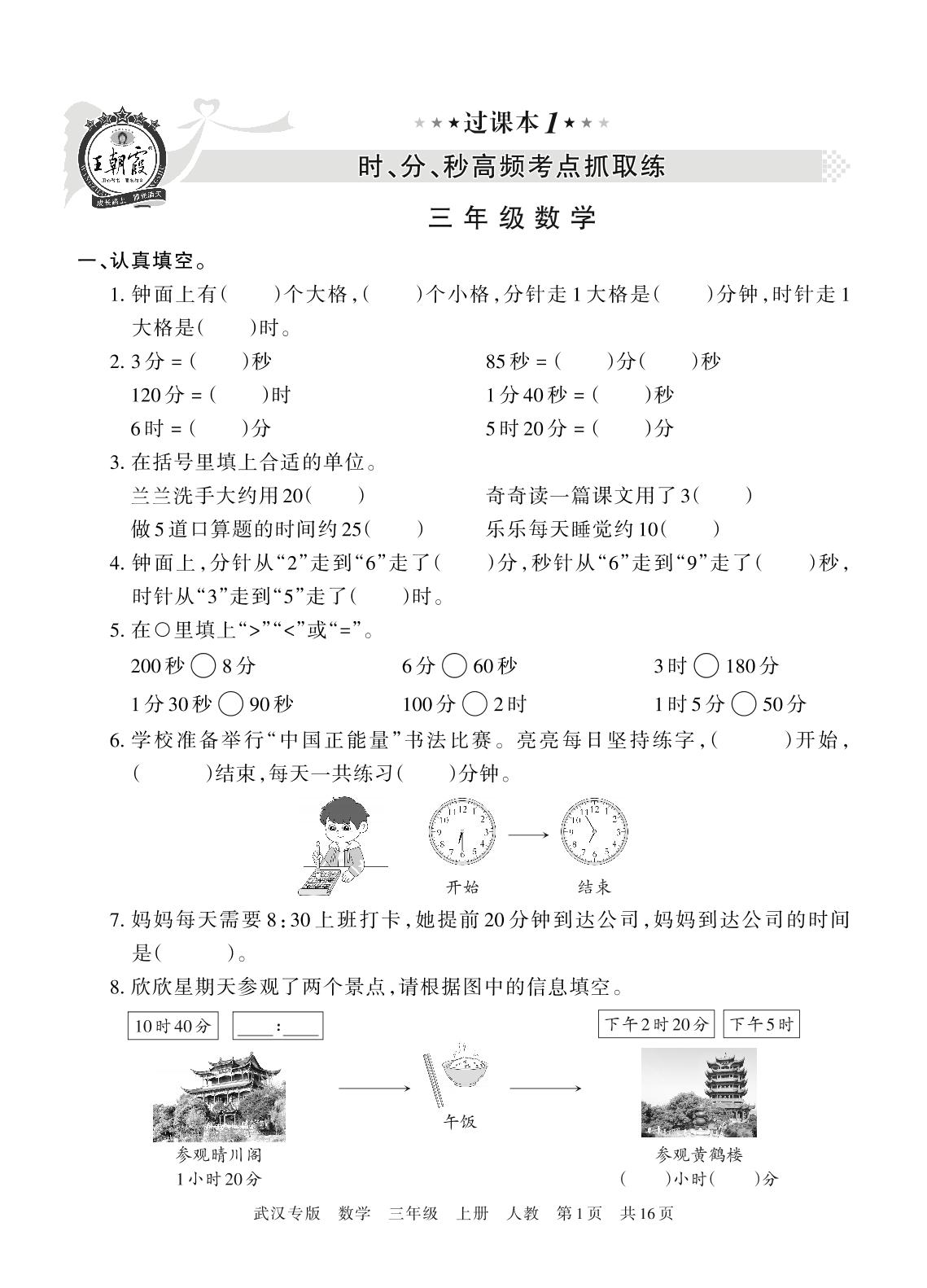 王朝霞期末过课本——时、分、秒高频考点抓取练三年级上册数学(人教版)_R211113104246089【1】