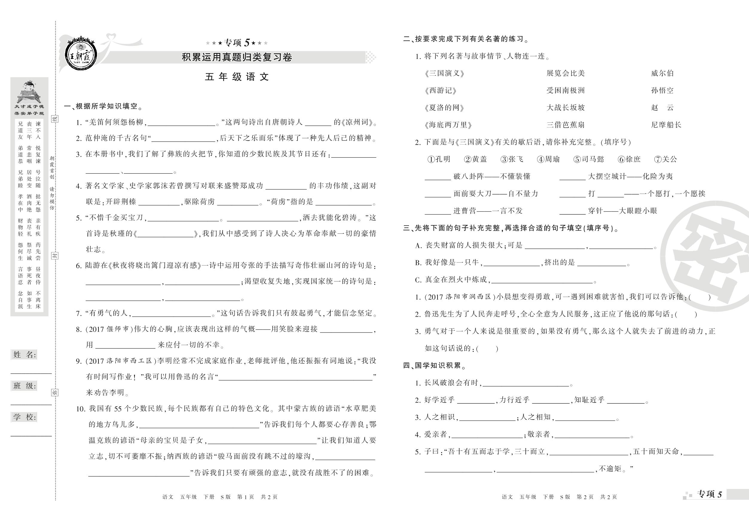 王朝霞期末专项卷——积累运用、课内阅读真题归类复习五年级下册语文(S版)_R210801202111【0】