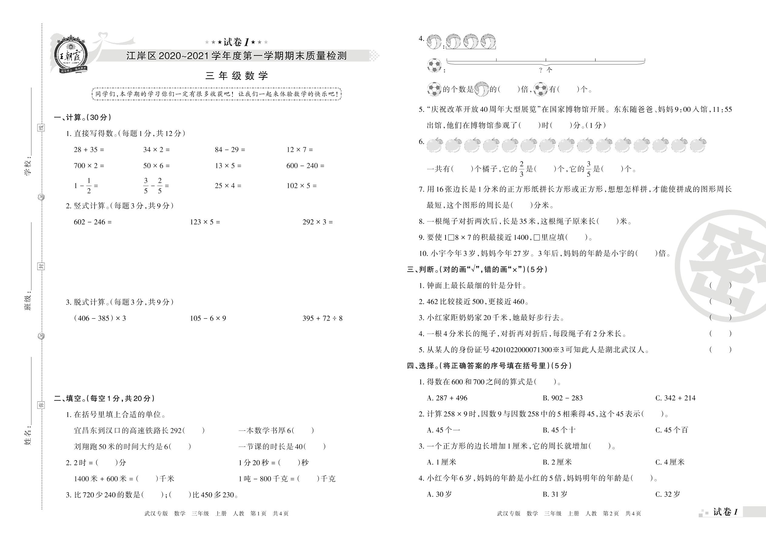 江岸区2020~2021学年度第一学期期末质量检测三年级数学(人教版)【1】