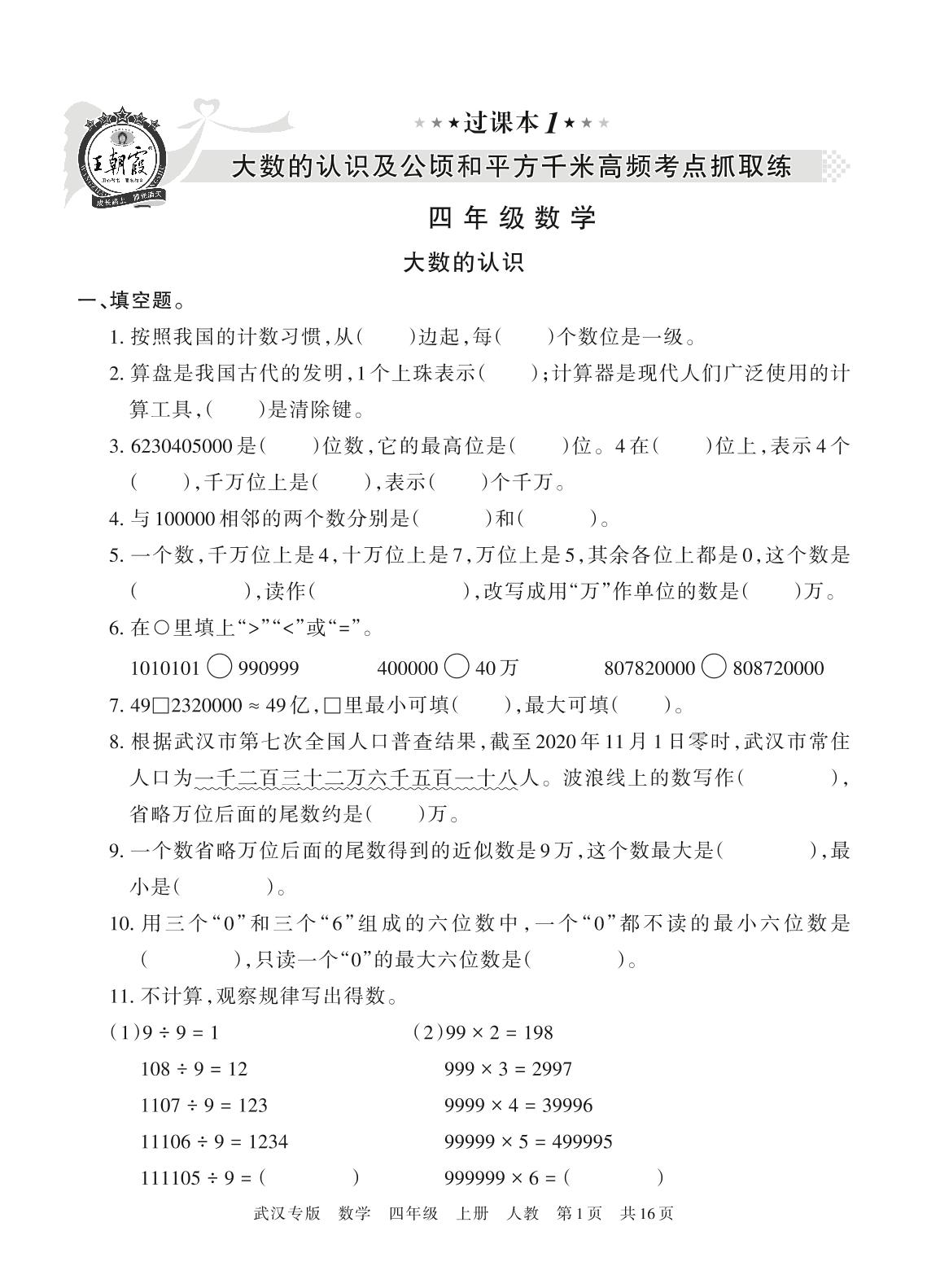 王朝霞期末过课本——大数的认识及公顷和平方千米高频考点抓取练四年级上册数学(人教版)【1】