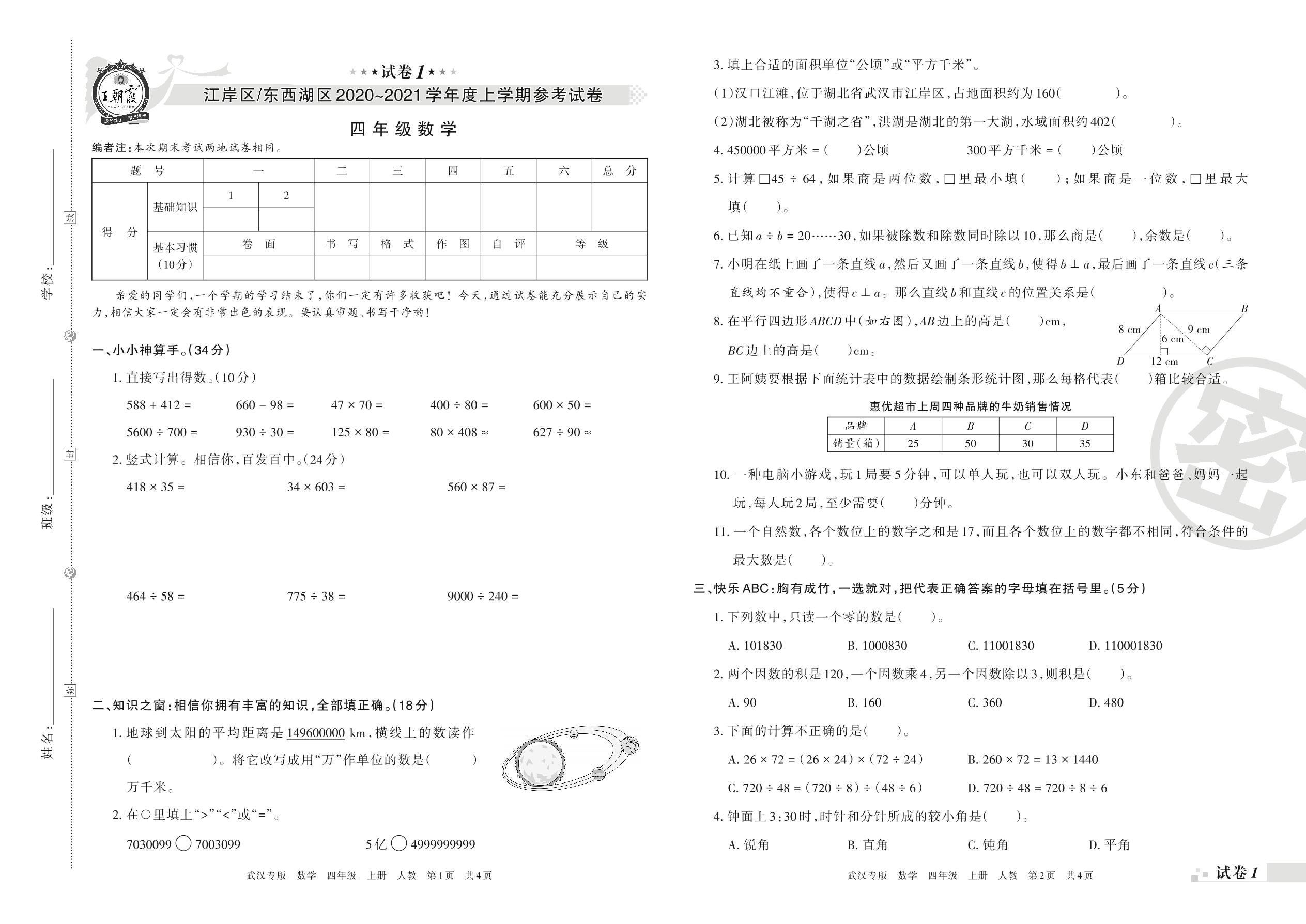 江岸区、东西湖区2020~2021学年度上学期参考试卷四年级数学(人教版)【1】