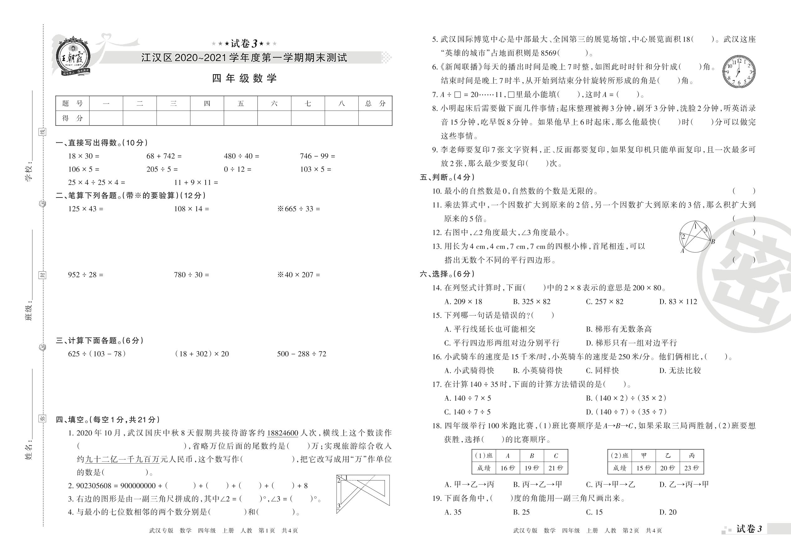 江汉区2020~2021学年度第一学期期末测试四年级数学(人教版)【3】