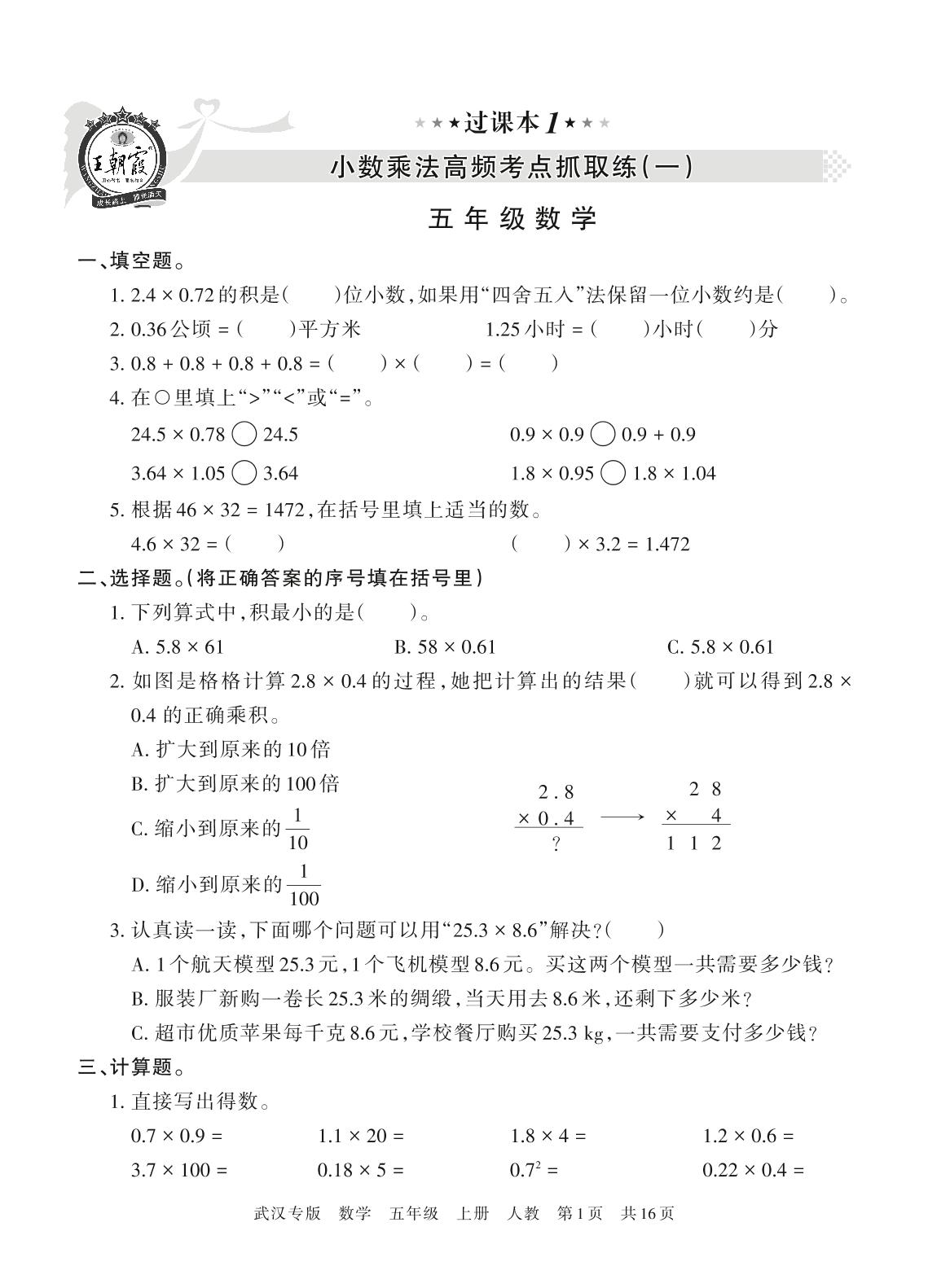 王朝霞期末过课本——小数乘法高频考点抓取练(一)五年级上册数学(人教版)_R211113104849612【1】