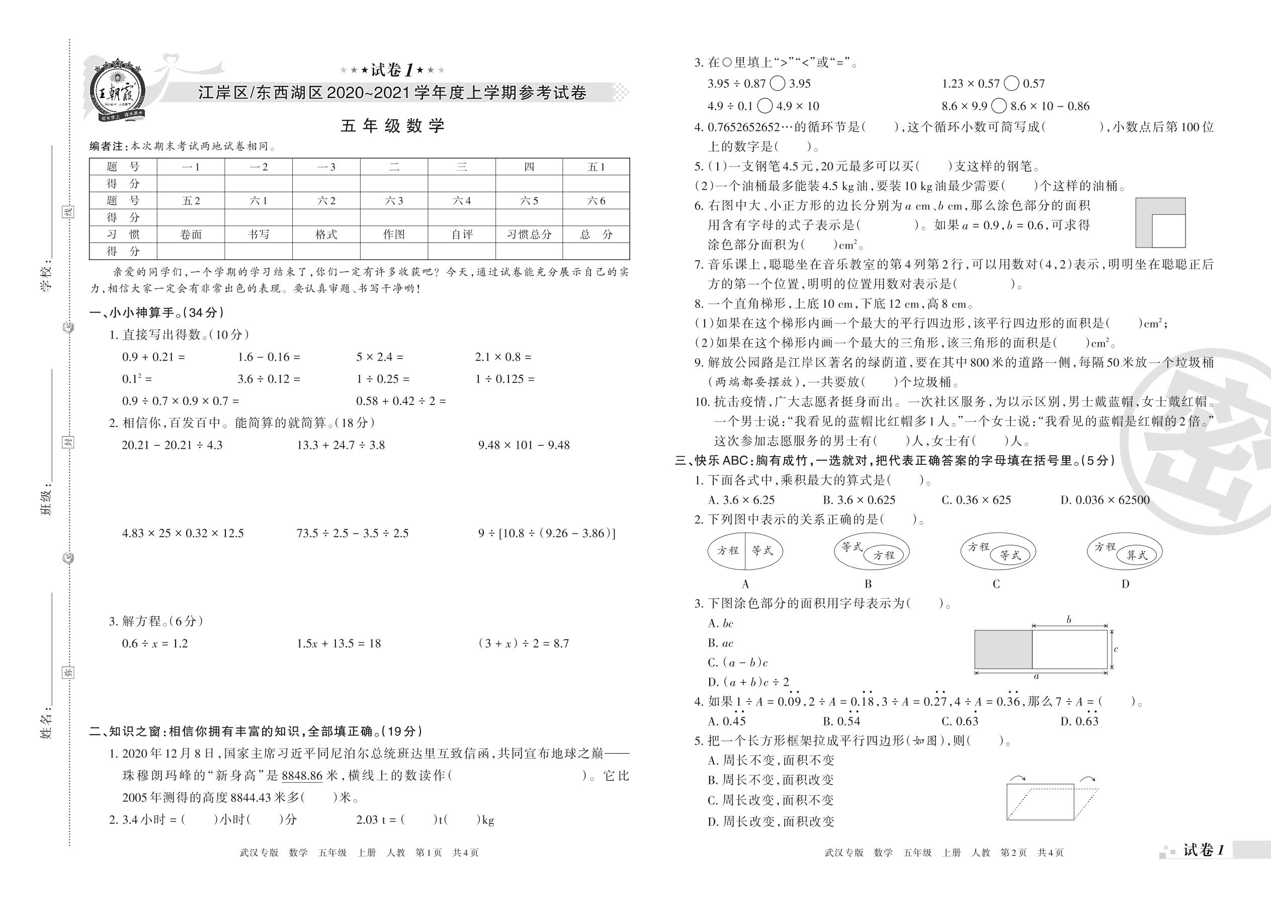 江岸区、东西湖区2020~2021学年度上学期参考试卷五年级数学(人教版)【1】