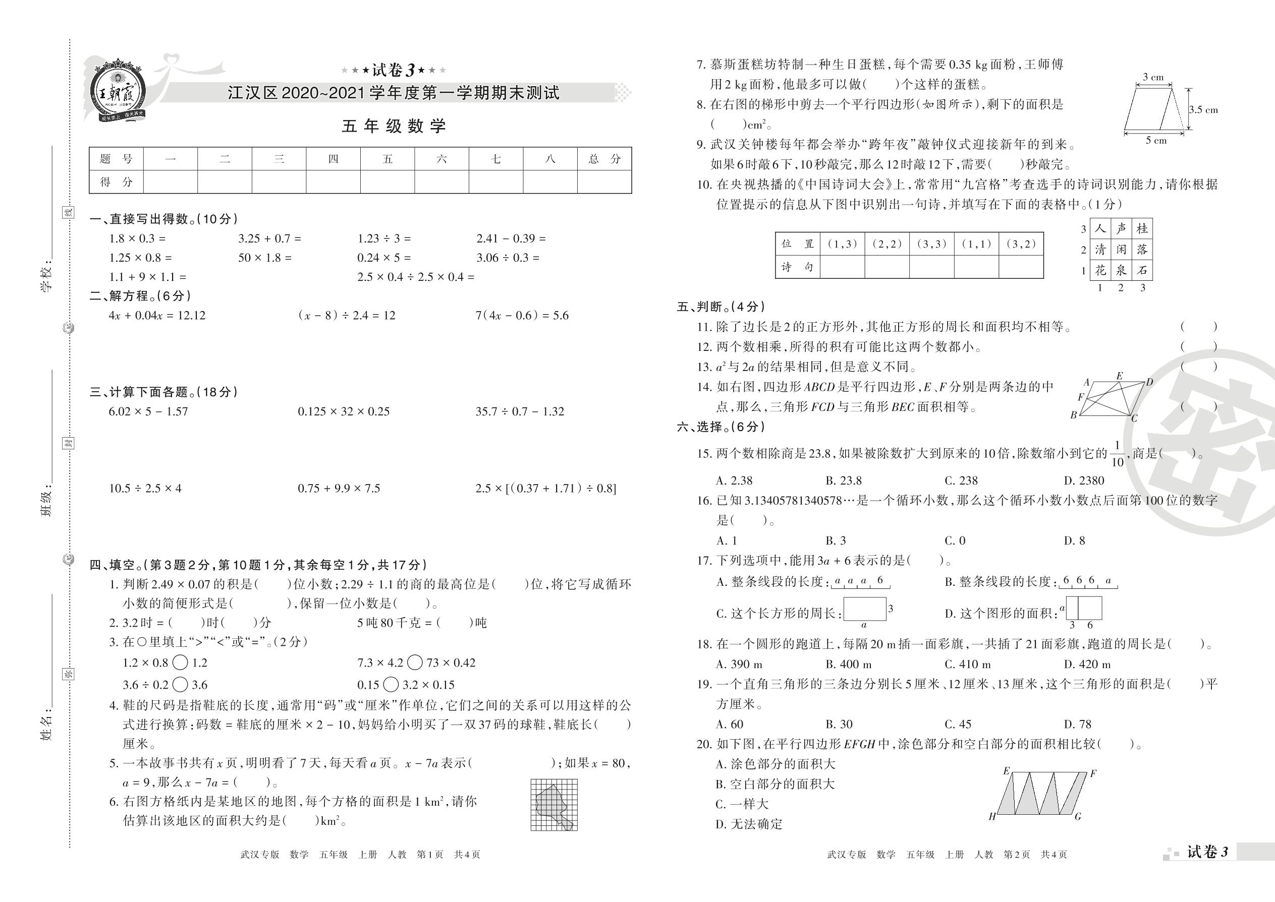 江汉区2020~2021学年度第一学期期末测试五年级数学(人教版)【3】
