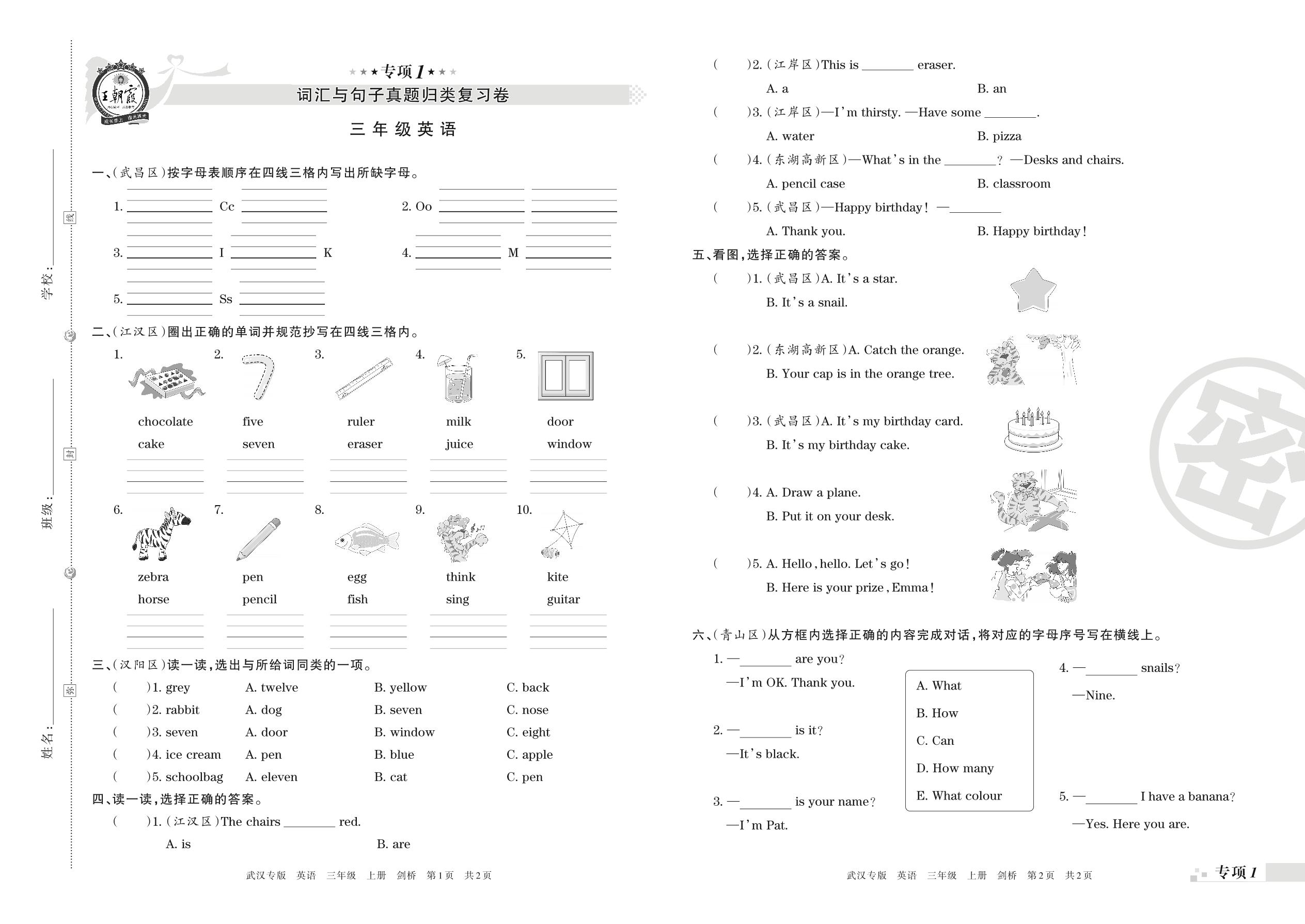 王朝霞期末专项卷——词汇与句子真题归类复习卷三年级上册英语(剑桥版)【1】