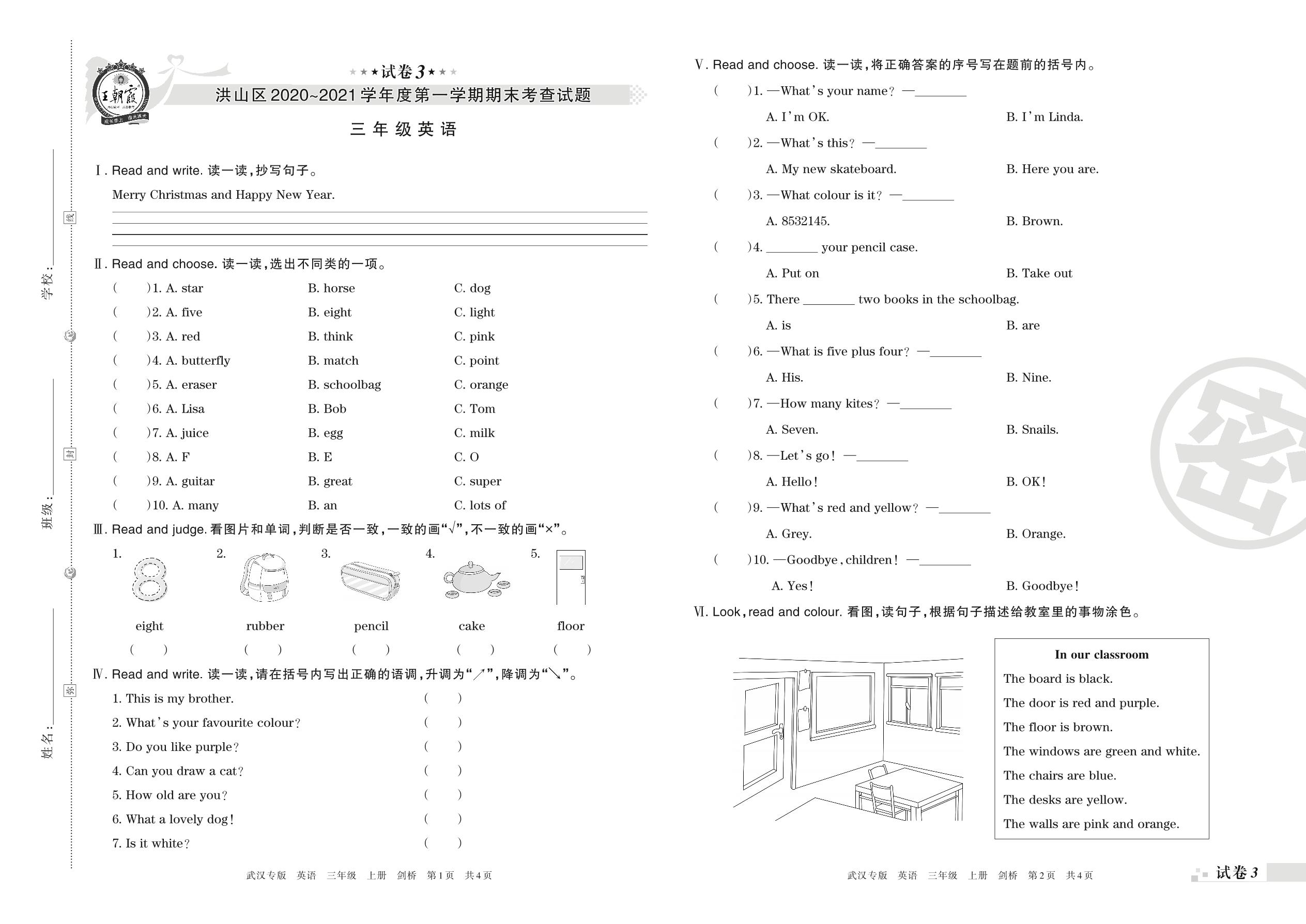 洪山区2020~2021学年度第一学期期末考查试题三年级英语(剑桥版)【3】