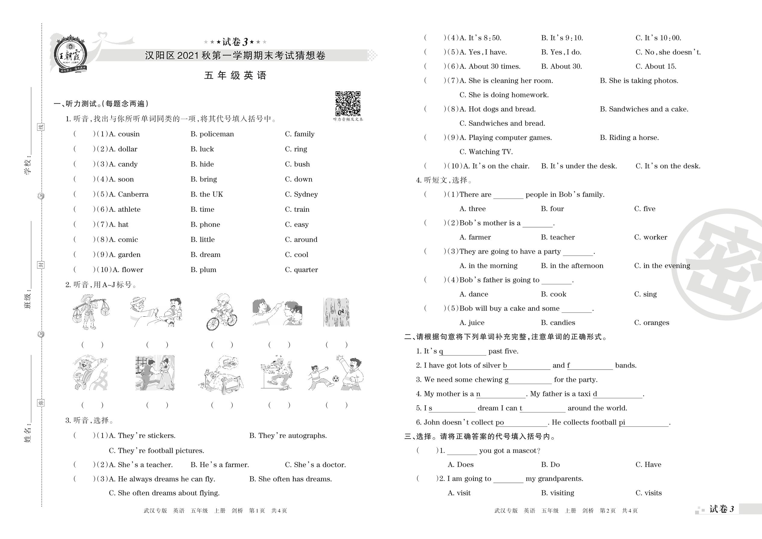 汉阳区2021秋第一学期期末考试猜想卷五年级英语(剑桥版)【3】