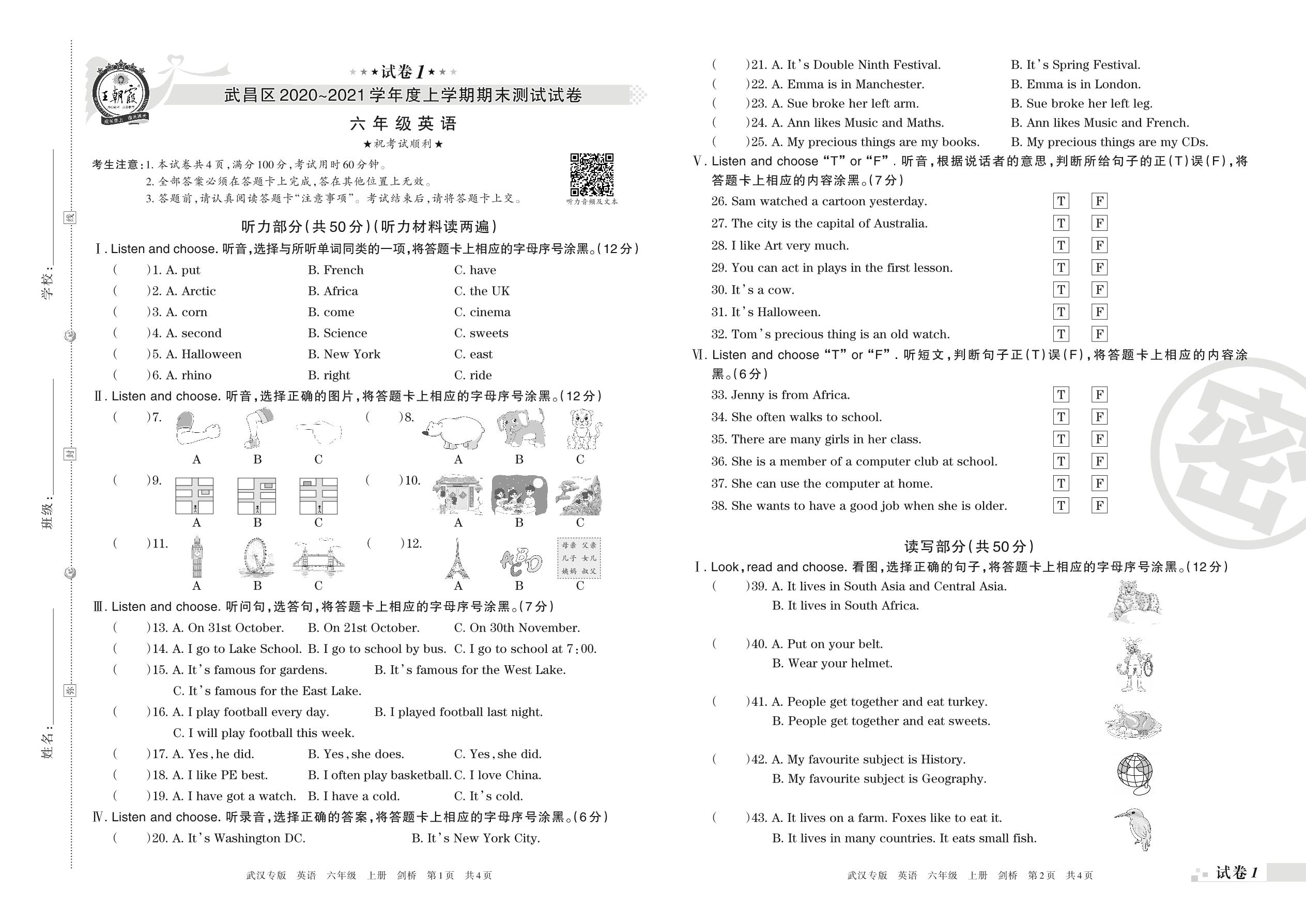 武昌区2020~2021学年度上学期期末测试试卷六年级英语(剑桥版)【1】