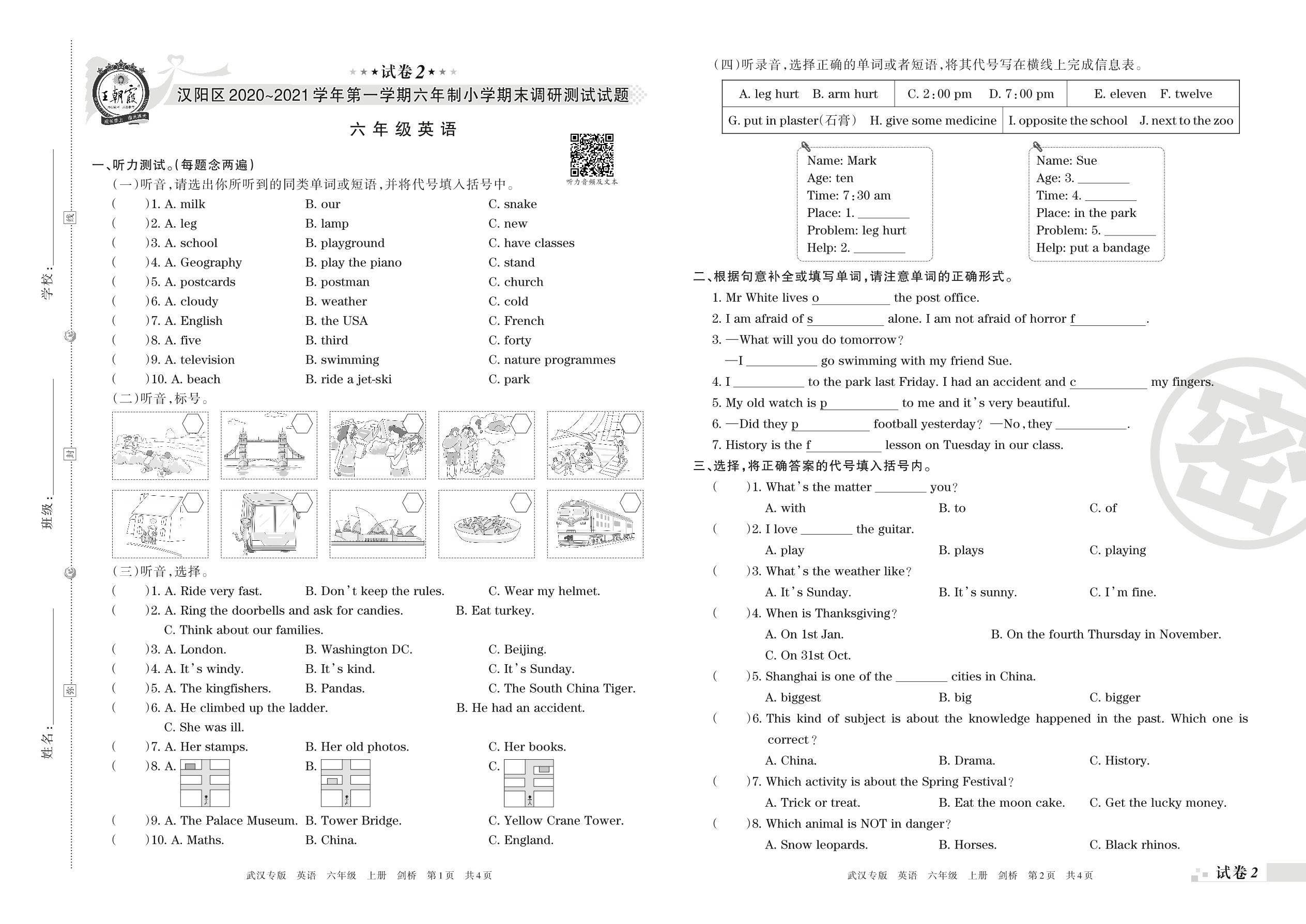 汉阳区2020~2021学年第一学期六年制小学期末调研测试试题六年级英语(剑桥版)【2】