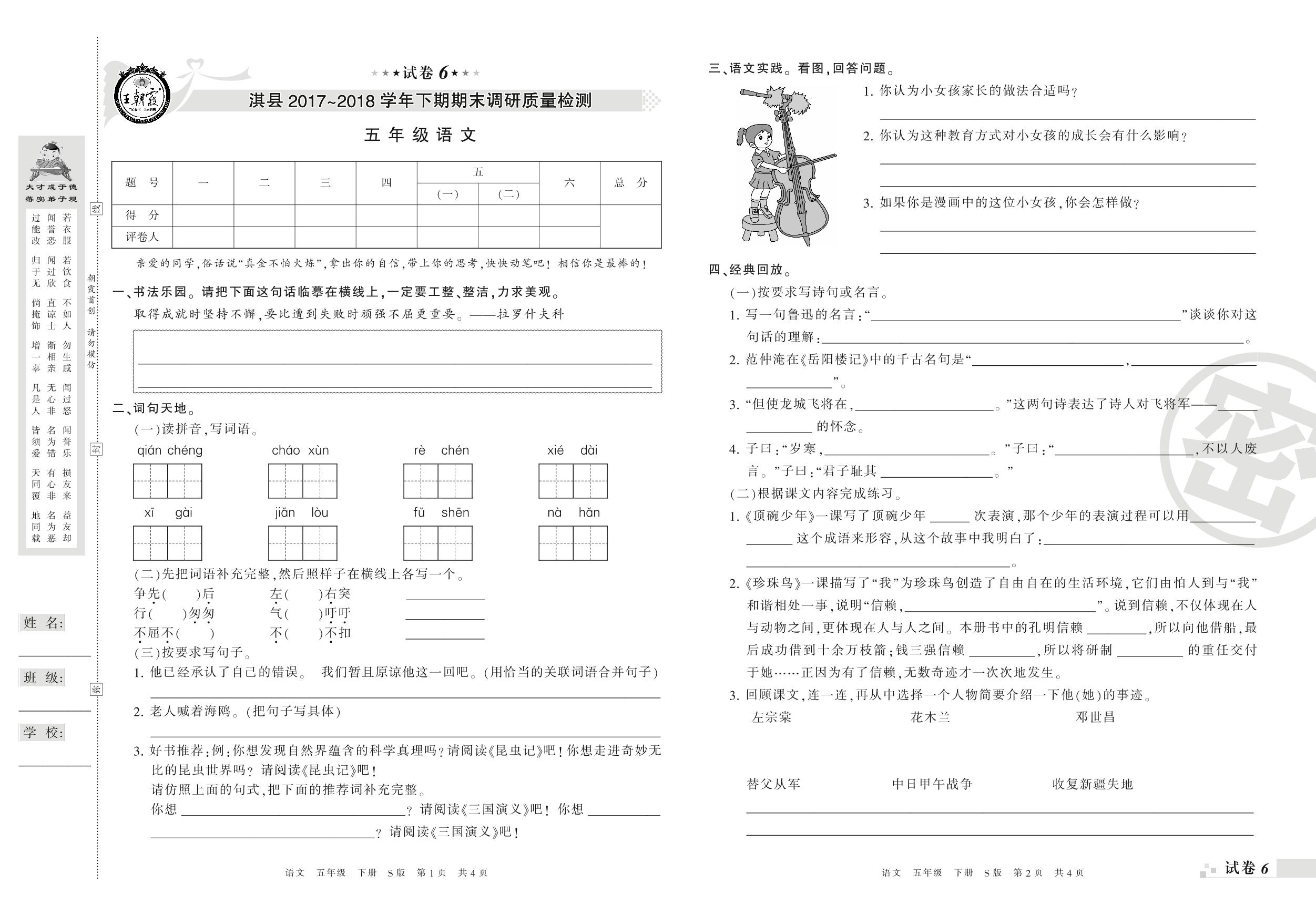 2017-2018学年第二学期鹤壁市淇县五年级语文试卷(S版)【6】