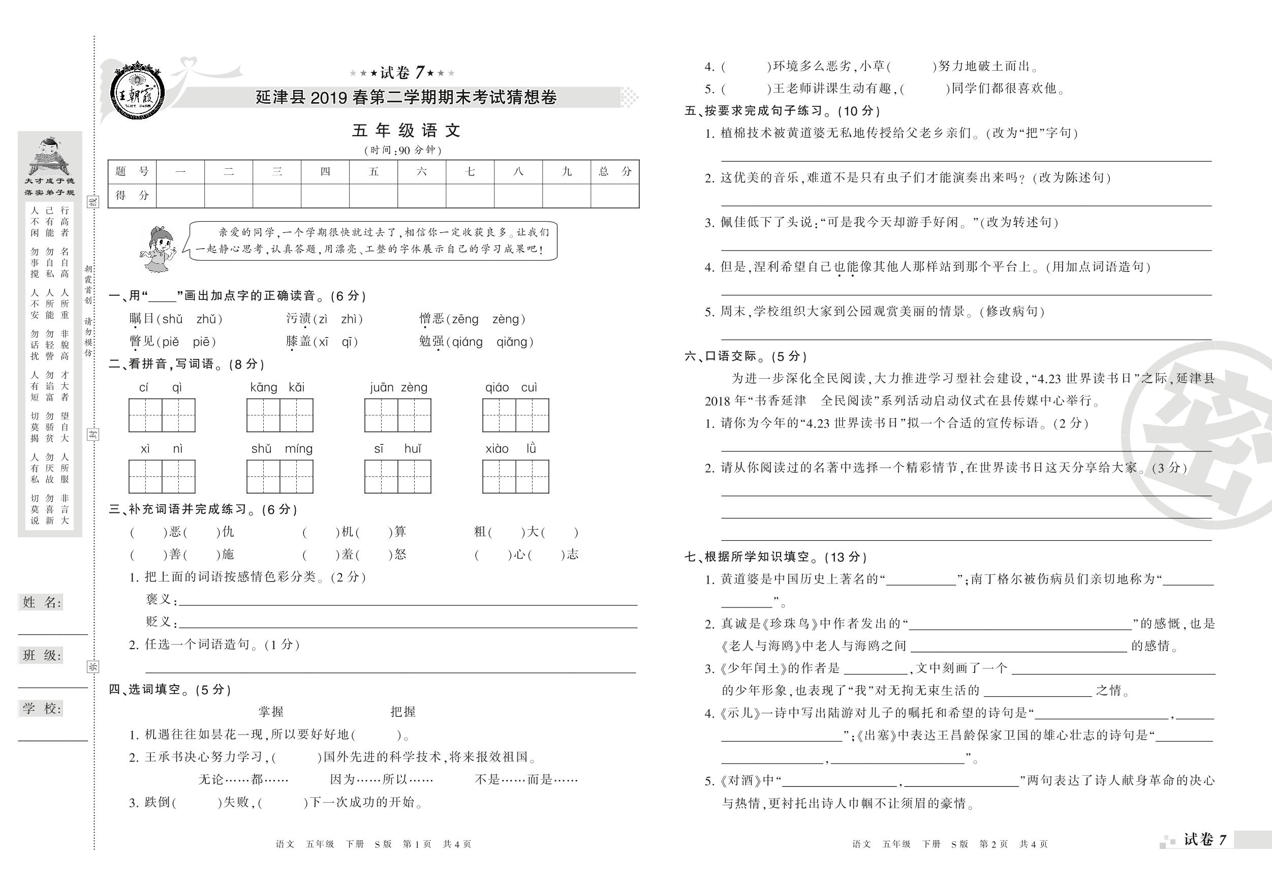 2017-2018学年第二学期新乡市延津县区五年级语文试卷(S版)【7】
