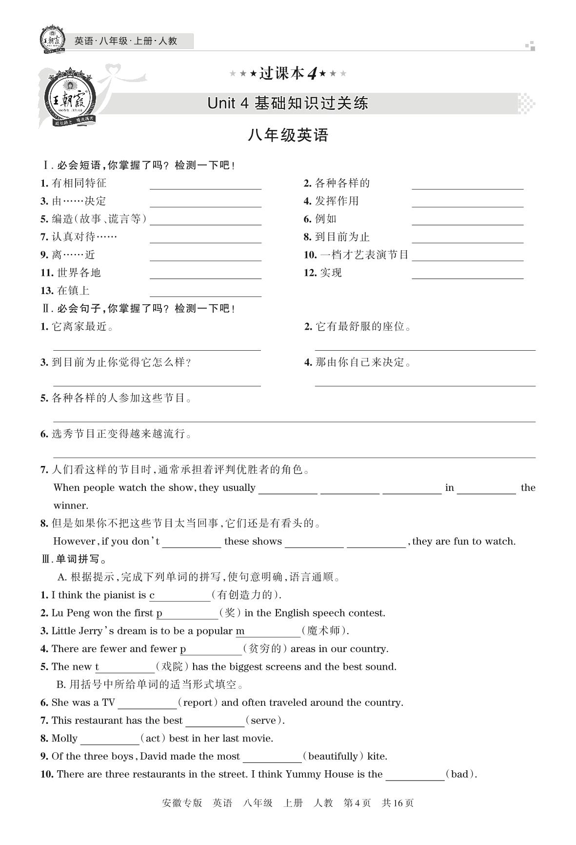 王朝霞期末过课本——Unit 4基础知识过关练八年级上册英语(人教版)【4】