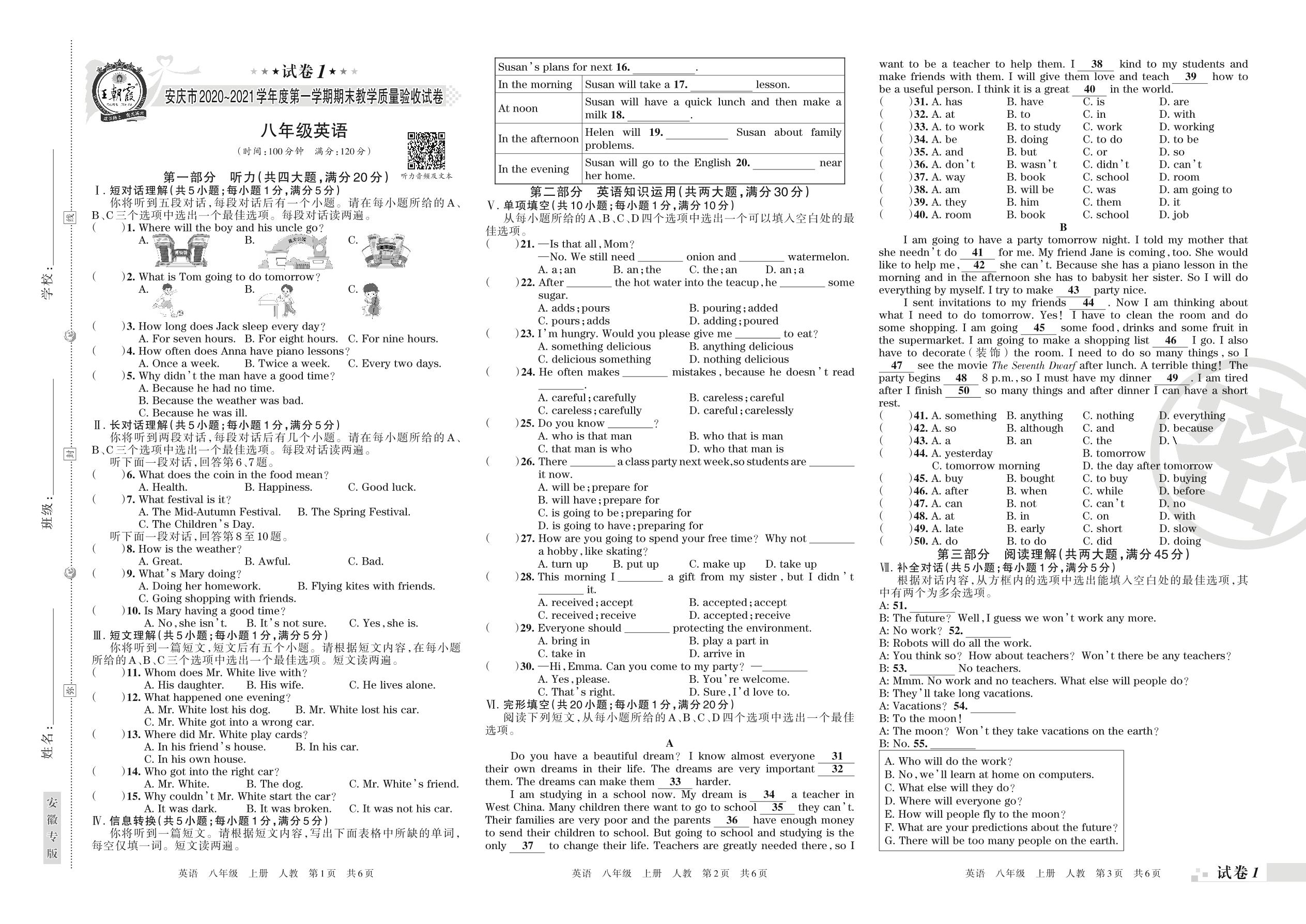 安庆市2020~2021学年度第一学期期末教学质量验收试卷八年级英语(人教版)【1】
