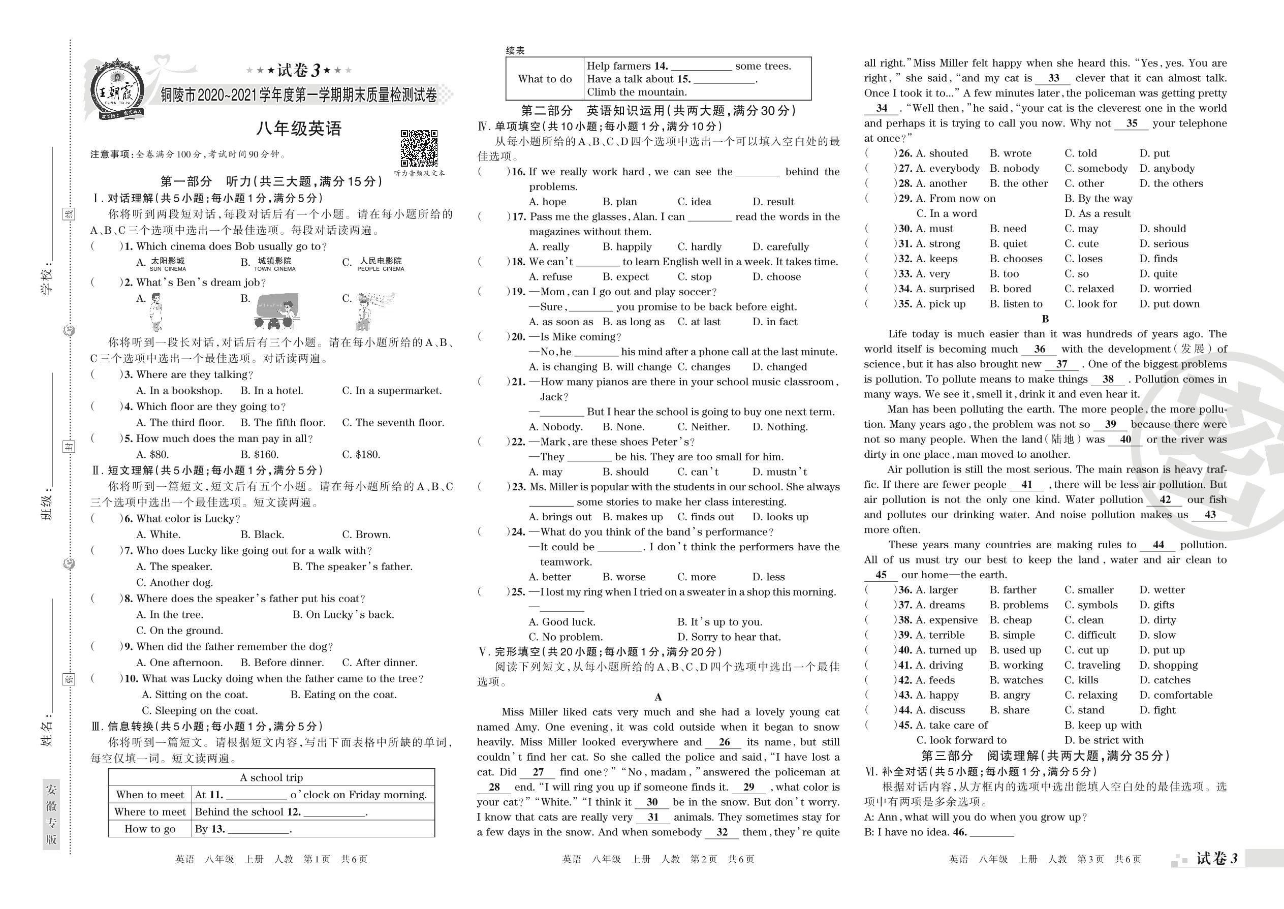 铜陵市2020~2021学年度第一学期期末质量检测试卷八年级英语(人教版)【3】