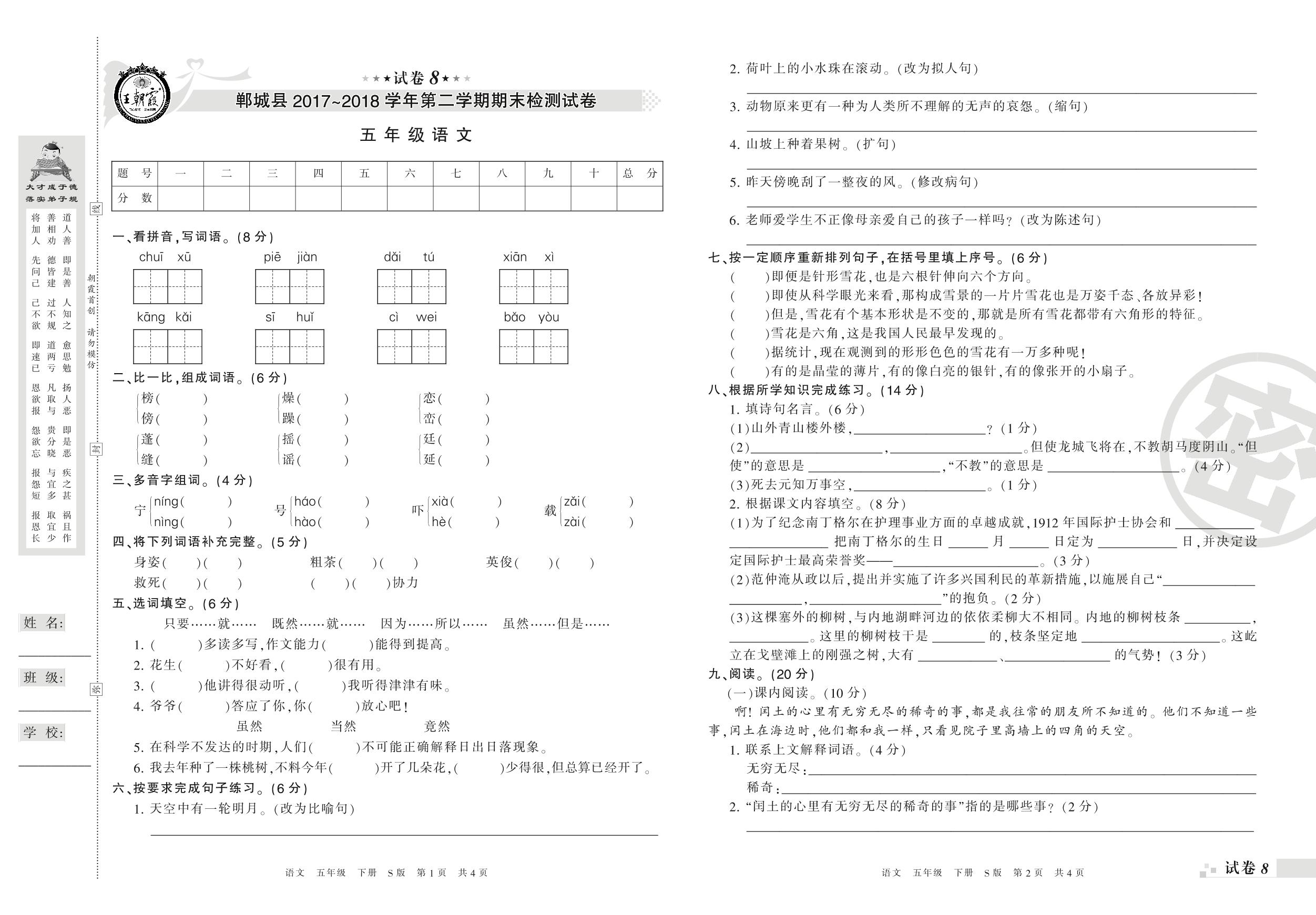 2017-2018学年第二学期周口市郸城县五年级语文试卷(S版)【8】