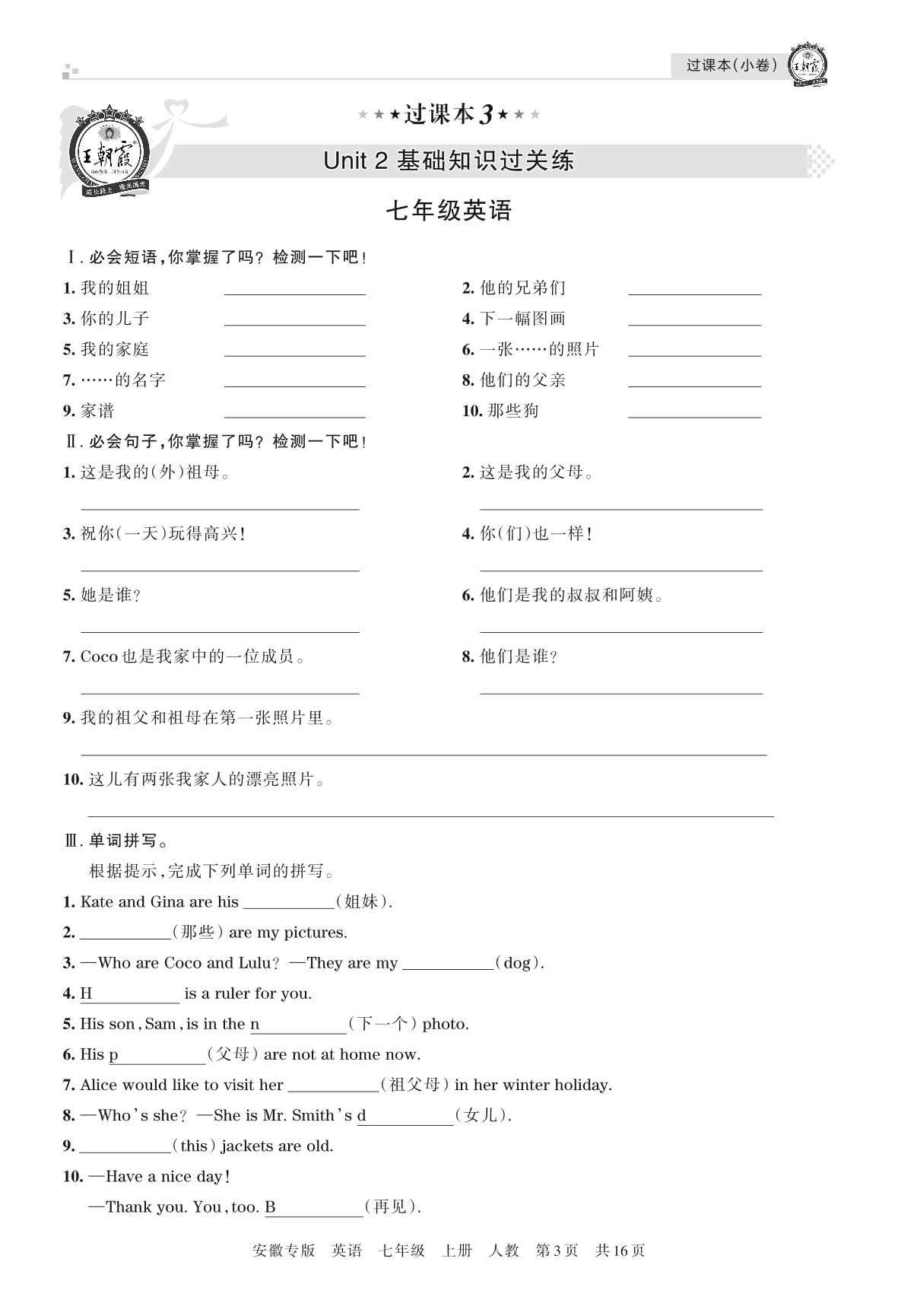王朝霞期末过课本——Unit 2基础知识过关练七年级上册英语(人教版)【3】