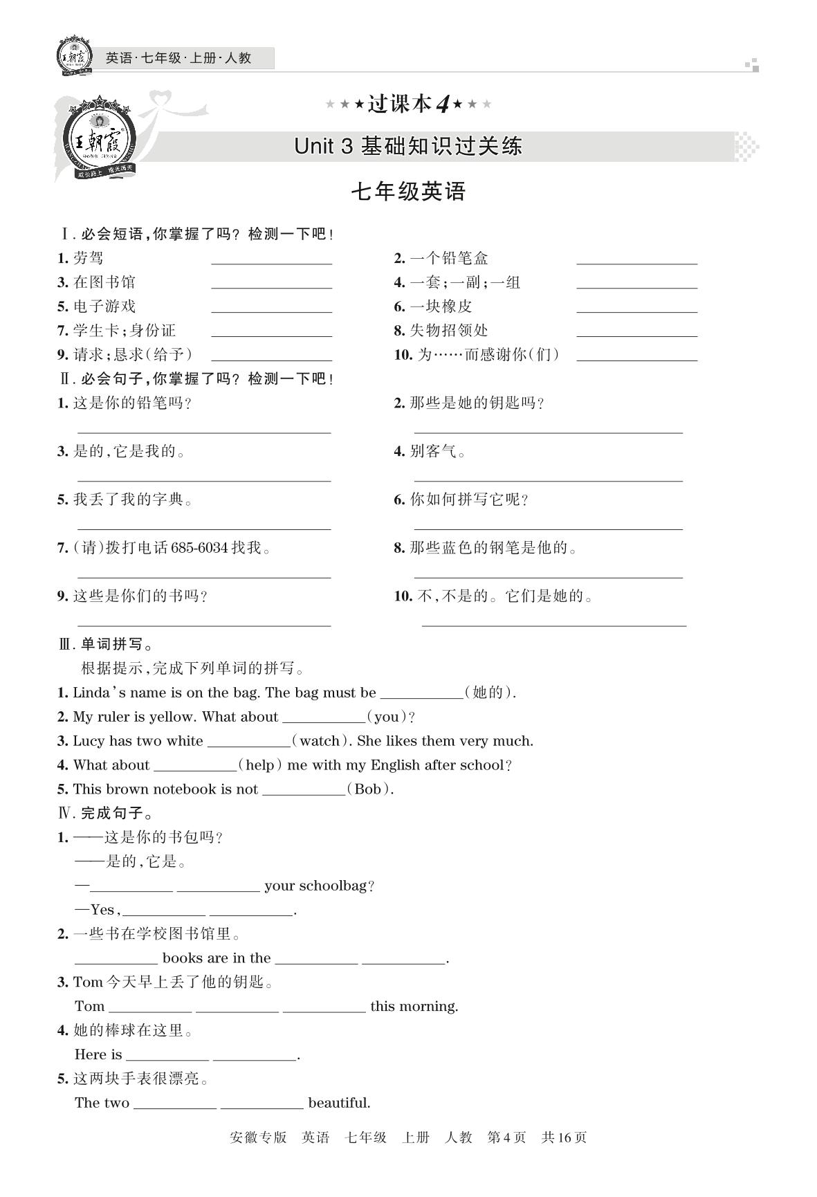 王朝霞期末过课本——Unit 3基础知识过关练七年级上册英语(人教版)【4】