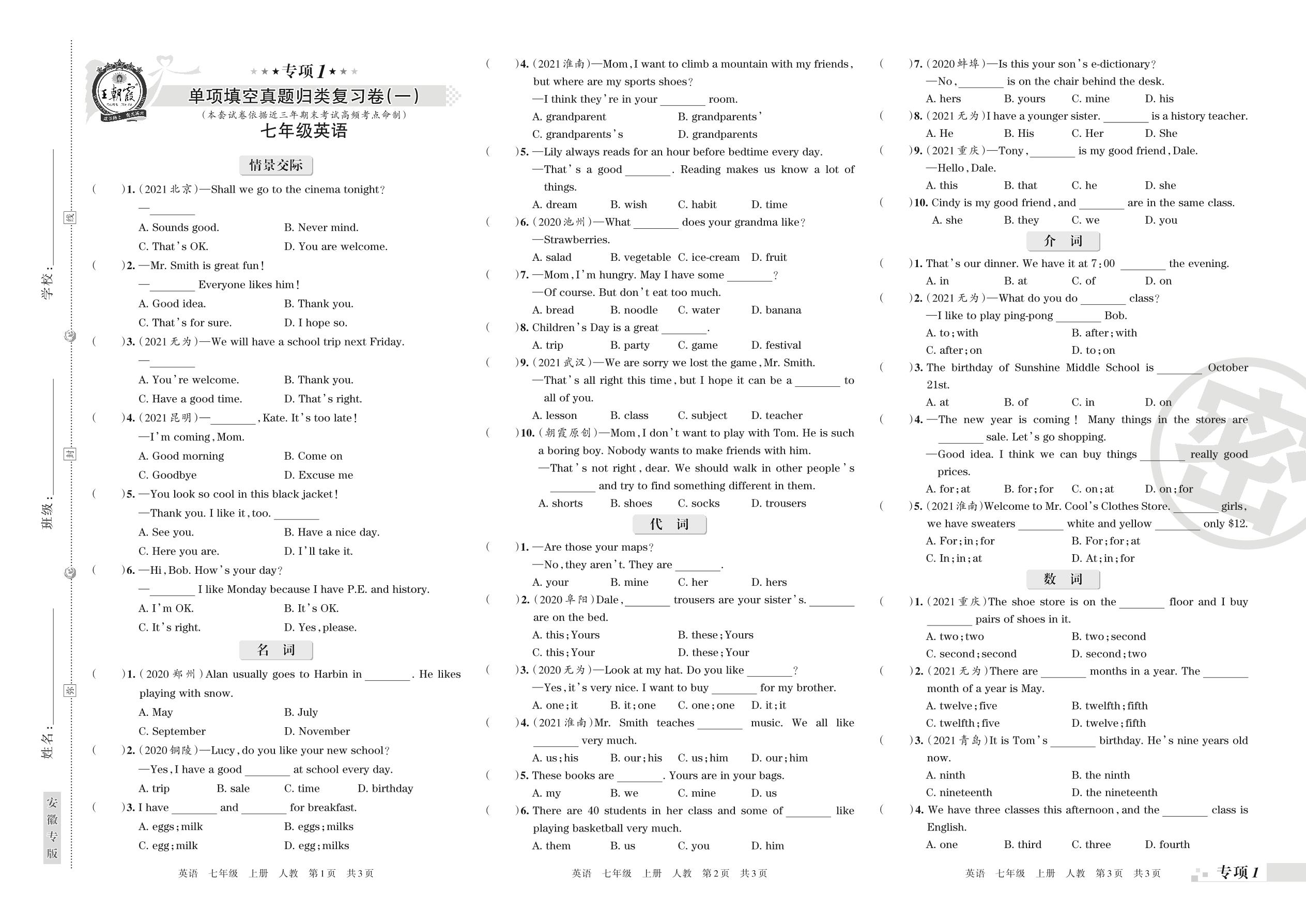 王朝霞期末专项卷——单项填空真题归类复习卷(一)七年级上册英语(人教版)【1】