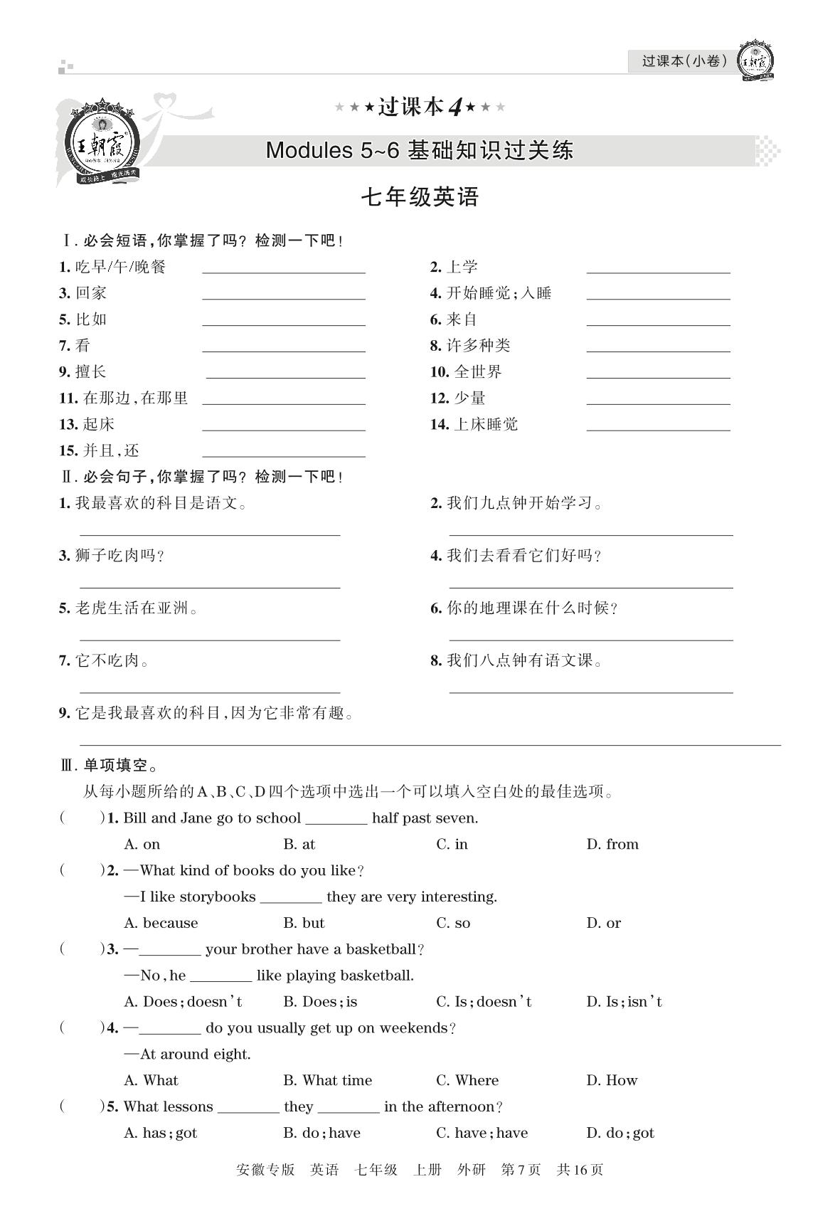 王朝霞期末过课本——Modules 5~6 基础知识过关练七年级上册英语(外研版)【4】
