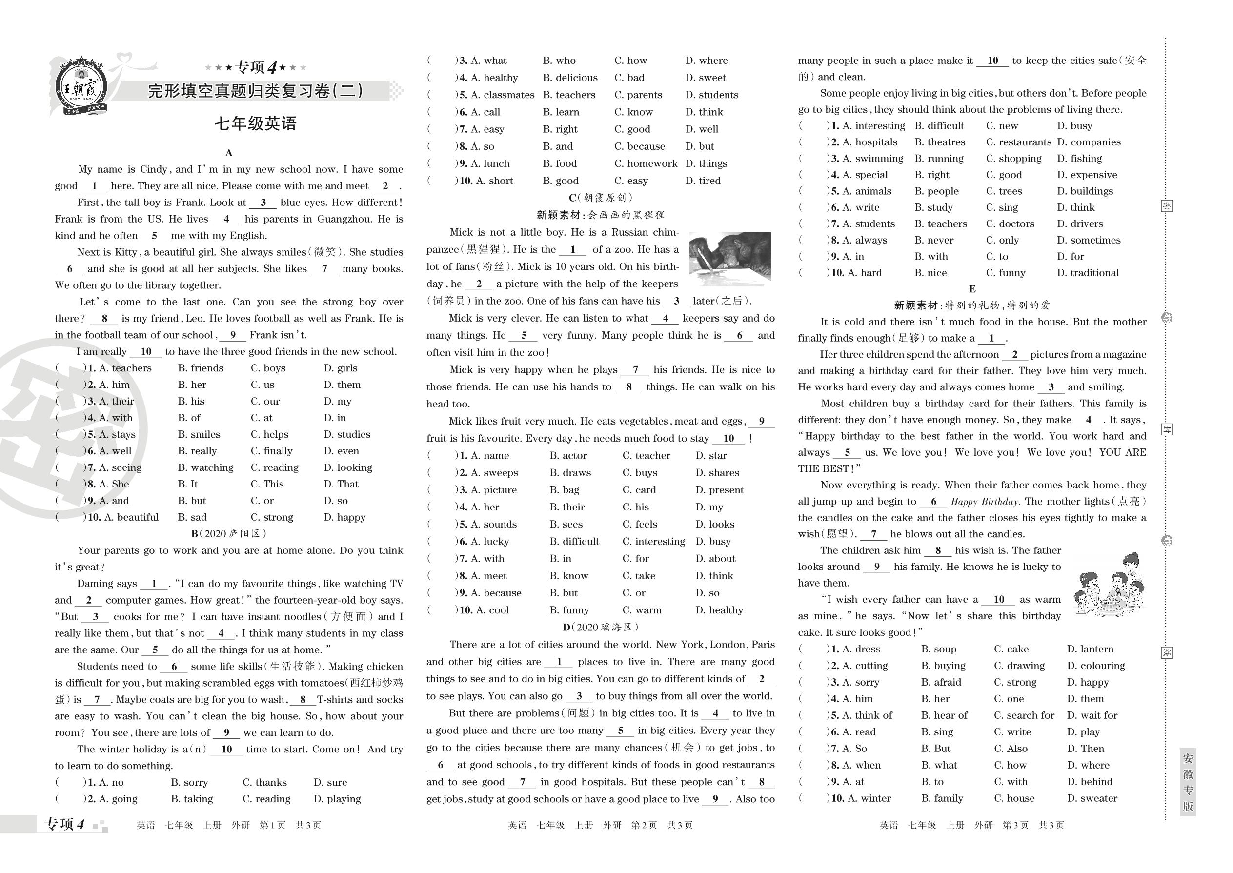王朝霞期末专项卷——完形填空真题归类复习卷(二)七年级上册英语(外研版)【4】