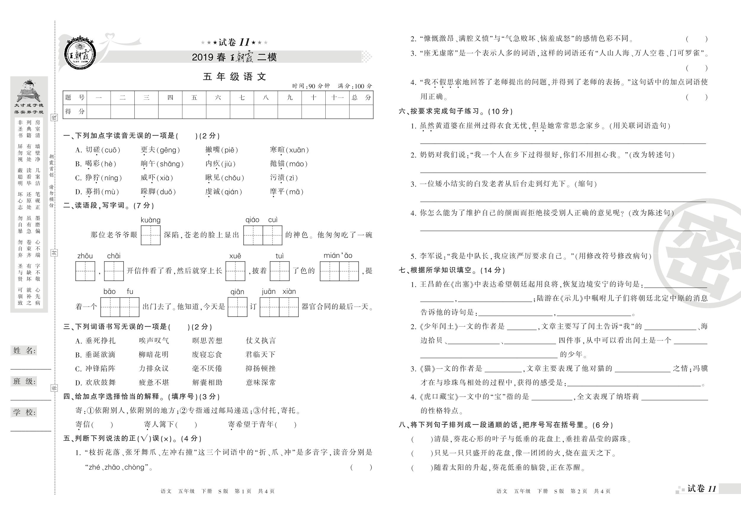 王朝霞期末模拟卷五年级下册语文(S版)【11】