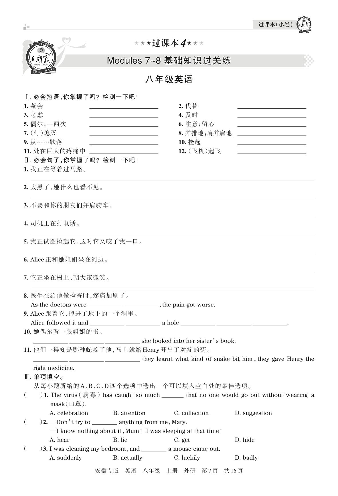 王朝霞期末过课本——Modules 7~8 基础知识过关练八年级上册英语(外研版)【4】