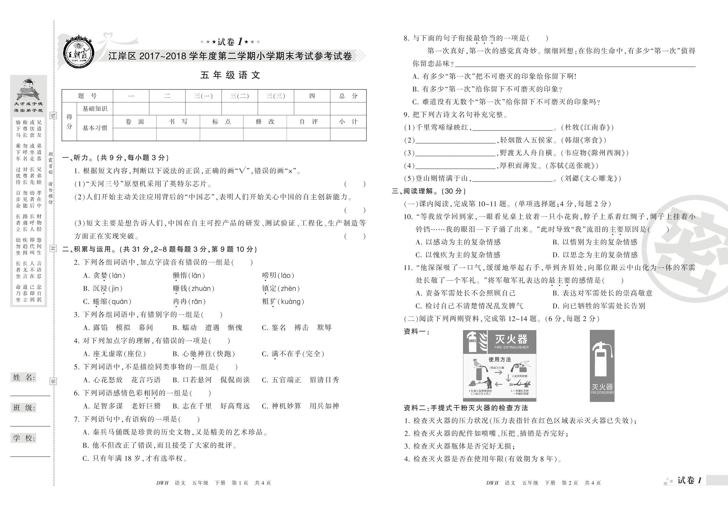 2017-2018学年第二学期武汉市江岸区五年级语文试卷(鄂教版)【1】