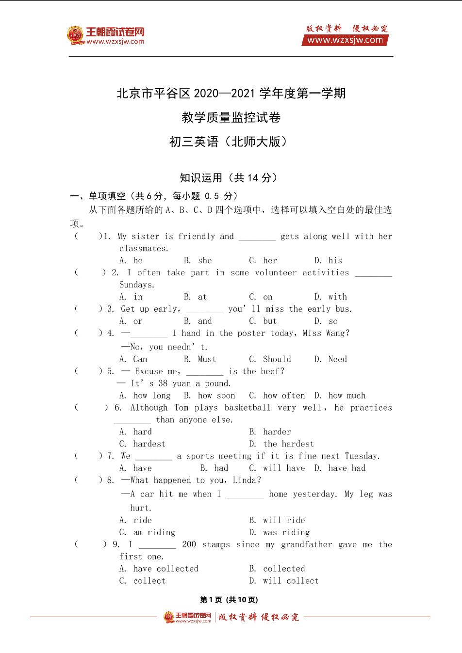 北京市平谷区2020—2021学年九年级上学期期末考试英语试题(北师大版)