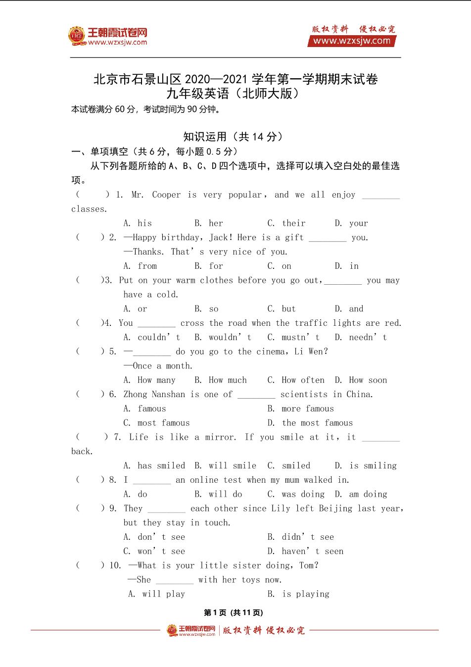 北京市石景山区2020—2021学年第一学期期末试卷九年级英语(北师大版)