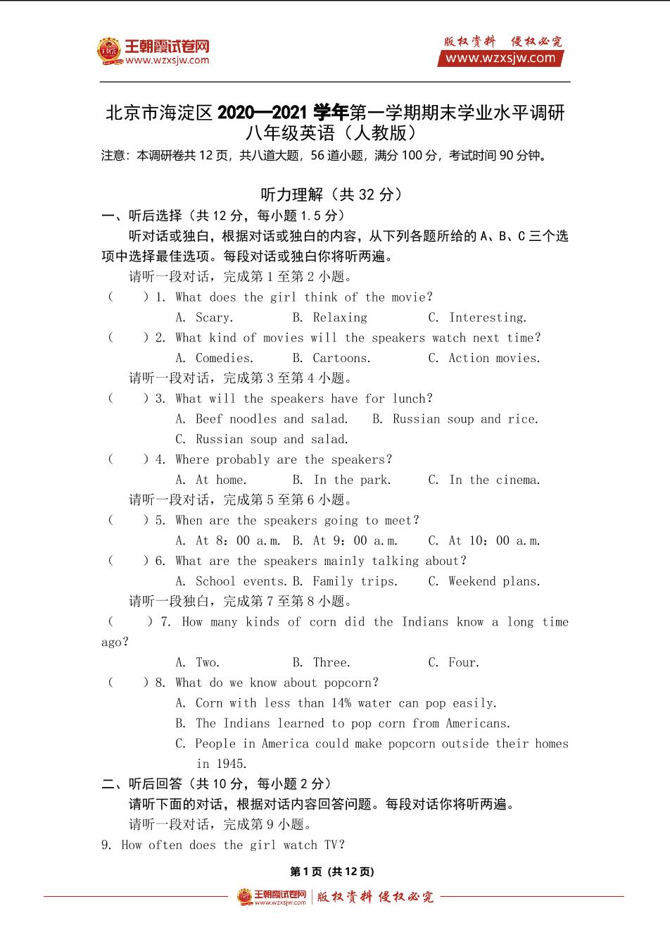 北京市海淀区2020—2021学年第一学期期末学业水平调研八年级英语(人教版)