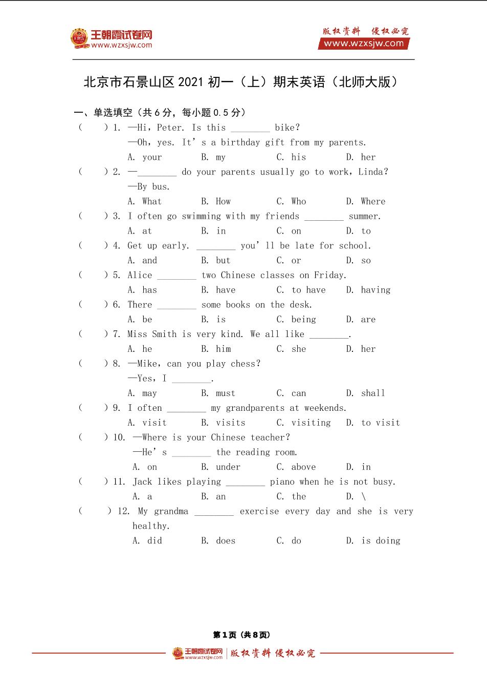 北京市石景山区2021初一(上)期末英语(北师大版)