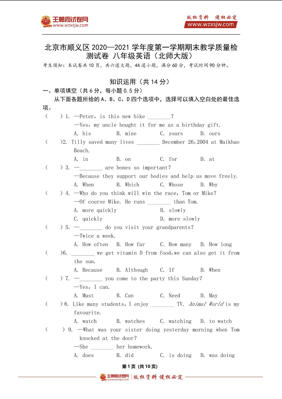 北京市顺义区2020—2021学年度第一学期期末教学质量检测试卷八年级英语(北师大版)