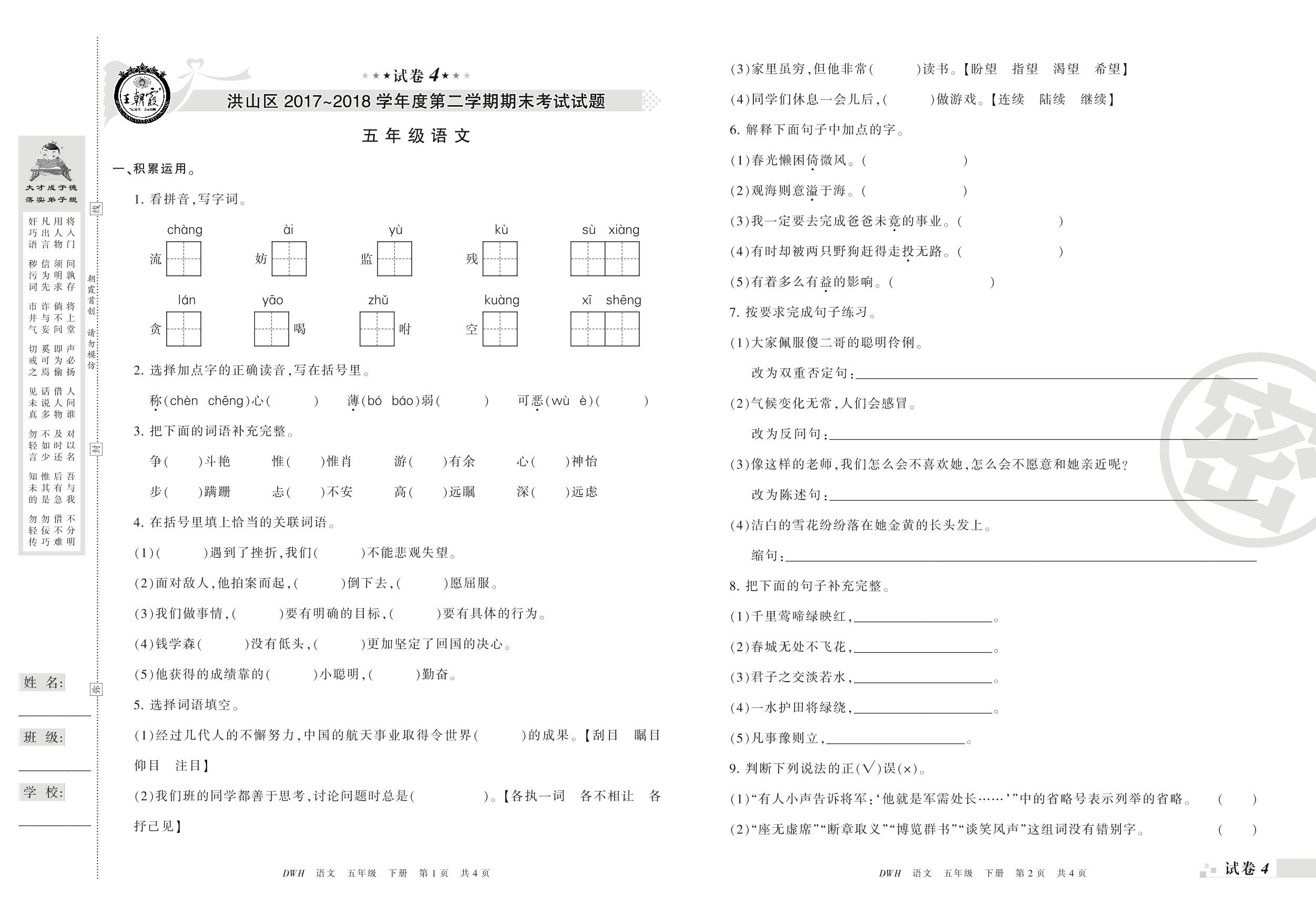 2017-2018学年第二学期武汉市洪山区五年级语文试卷(鄂教版)【4】