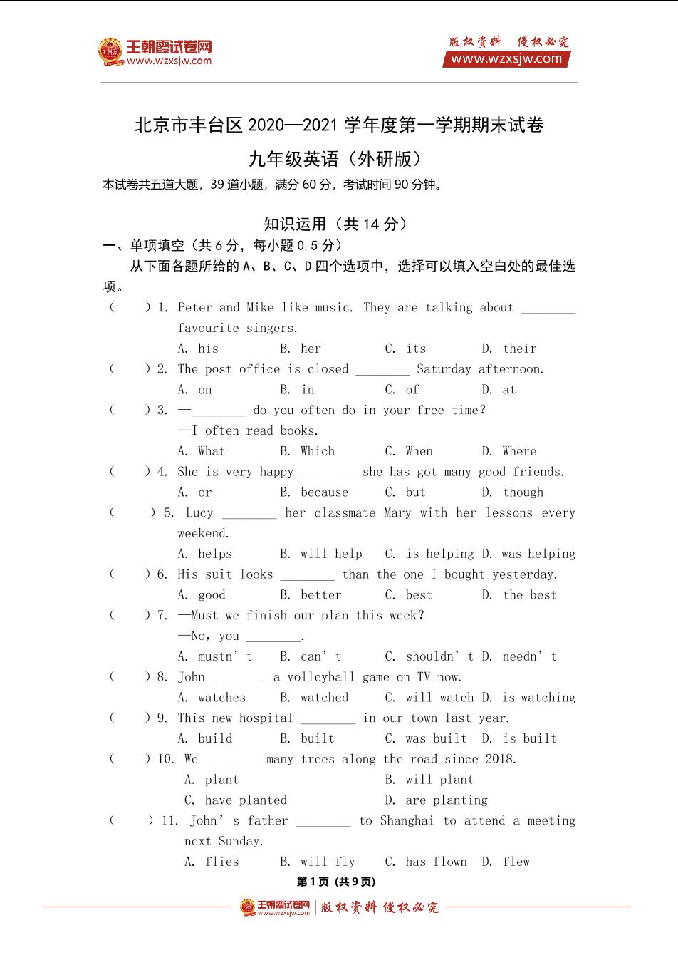 北京市丰台区2020—2021学年度第一学期期末试卷九年级英语(外研版)